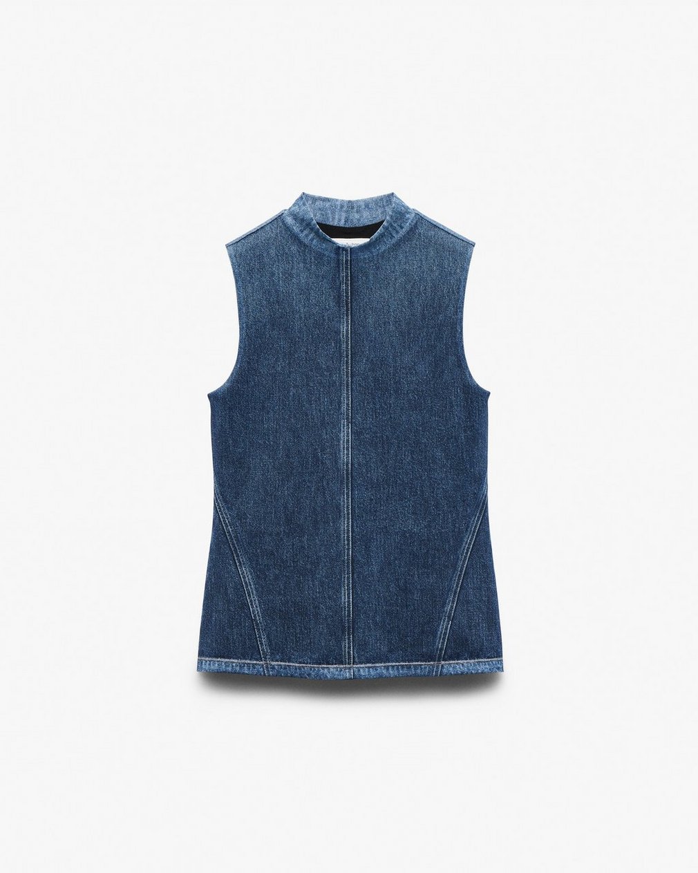 Whether you’re getting to know (or already adore) Miramar, our revolutionary printing technique that makes any material look like denim, you’ll love it in our mesh fabric. This sleeveless top is cut and sewn from stretchy mesh that’s printed on the outside to resemble rich indigo-wash denim. Breathable and figure-flattering, the lined style further achieves its comfortable feel and slim fit with the seams and denim details digitally printed on the fabric.
