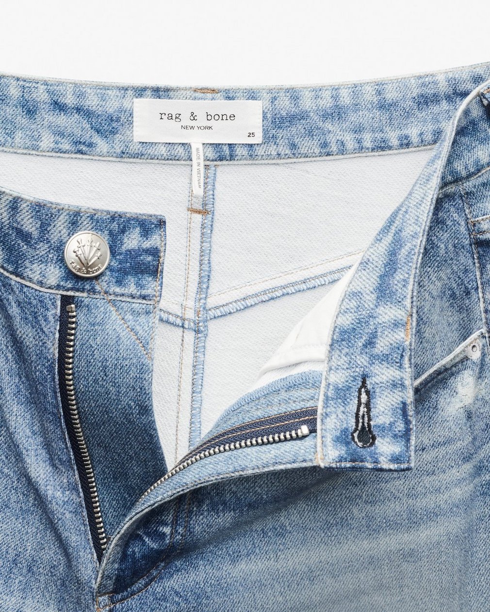 ? 100% cotton? Machine wash cold inside out & lay flat to dry? Trompe l’oeil denim print on terry fabric? Digitally printed rivets and rb embroidery?? Signature metal dagger button, zip fly? Functional belt loops? Zip fly with a button closure? Functional front pockets? Digitally printed back pockets and coin pocket? Imported