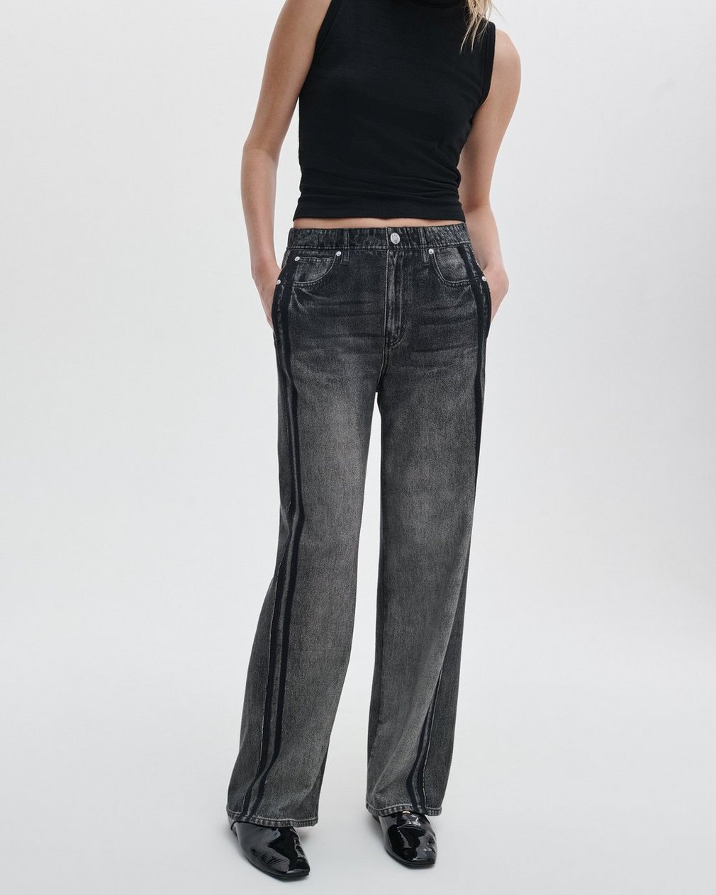 Miramar, our revolutionary printing technique, makes any material look like denim. These wide-leg track pants are cut and sewn from cotton terry cloth that’s ultra-soft on the inside and printed on the outside to look like your favorite jeans. Featuring a pull-on elastic waistband and hidden side-seam pockets, the mid-rise style further achieves its comfortable fit and feel with its sporty side stripes, other pockets, and denim details digitally printed on the fabric.