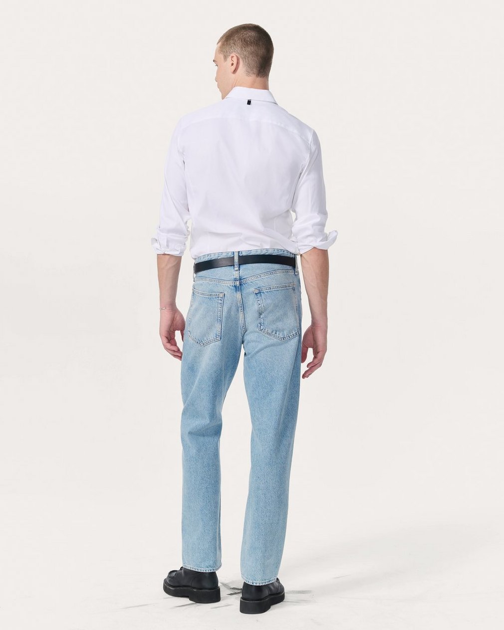 ? 73% cotton, 24% polyamide, 3% elastane? Distressed buttons at center front and cuff, bone button at the sleeve placket? Button closure ? Machine wash cold & lay flat to dry? Imported