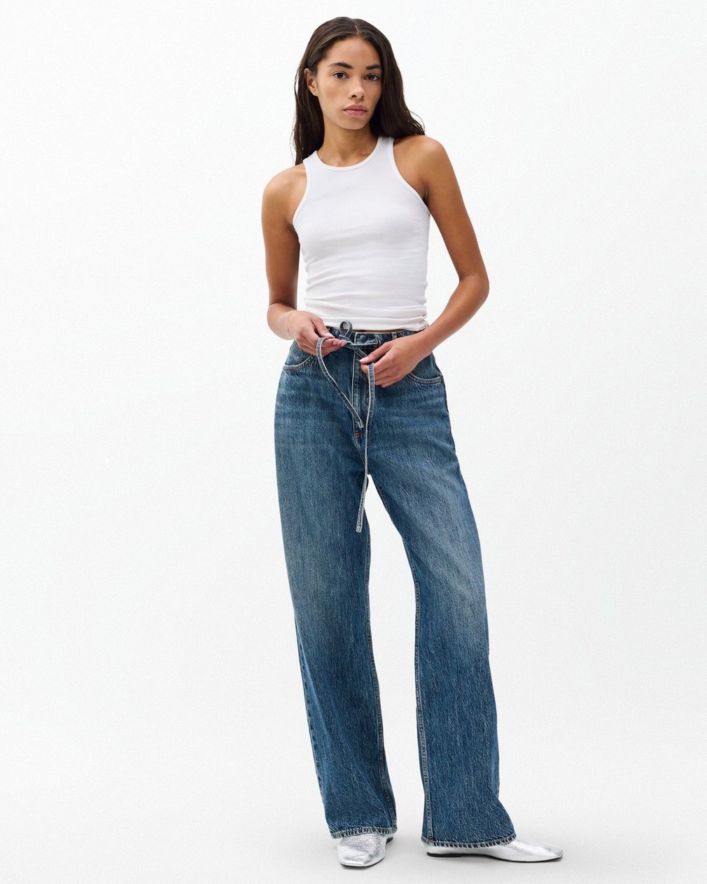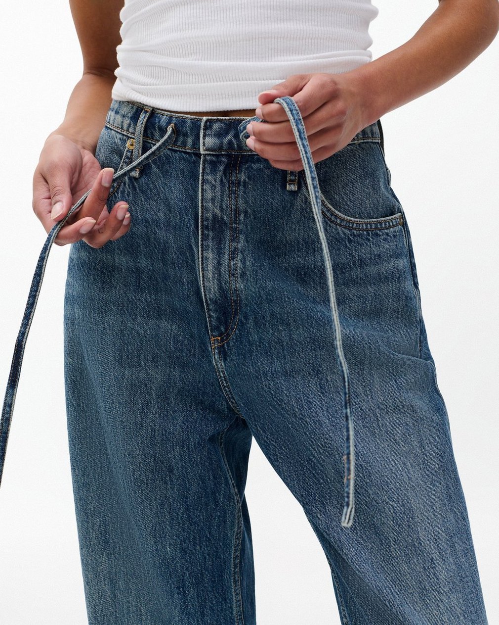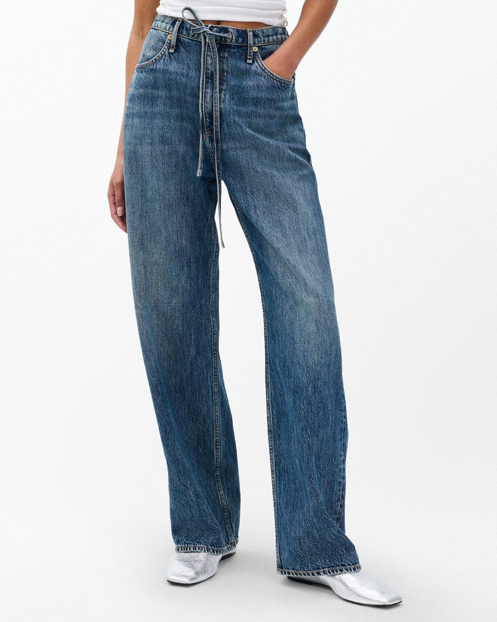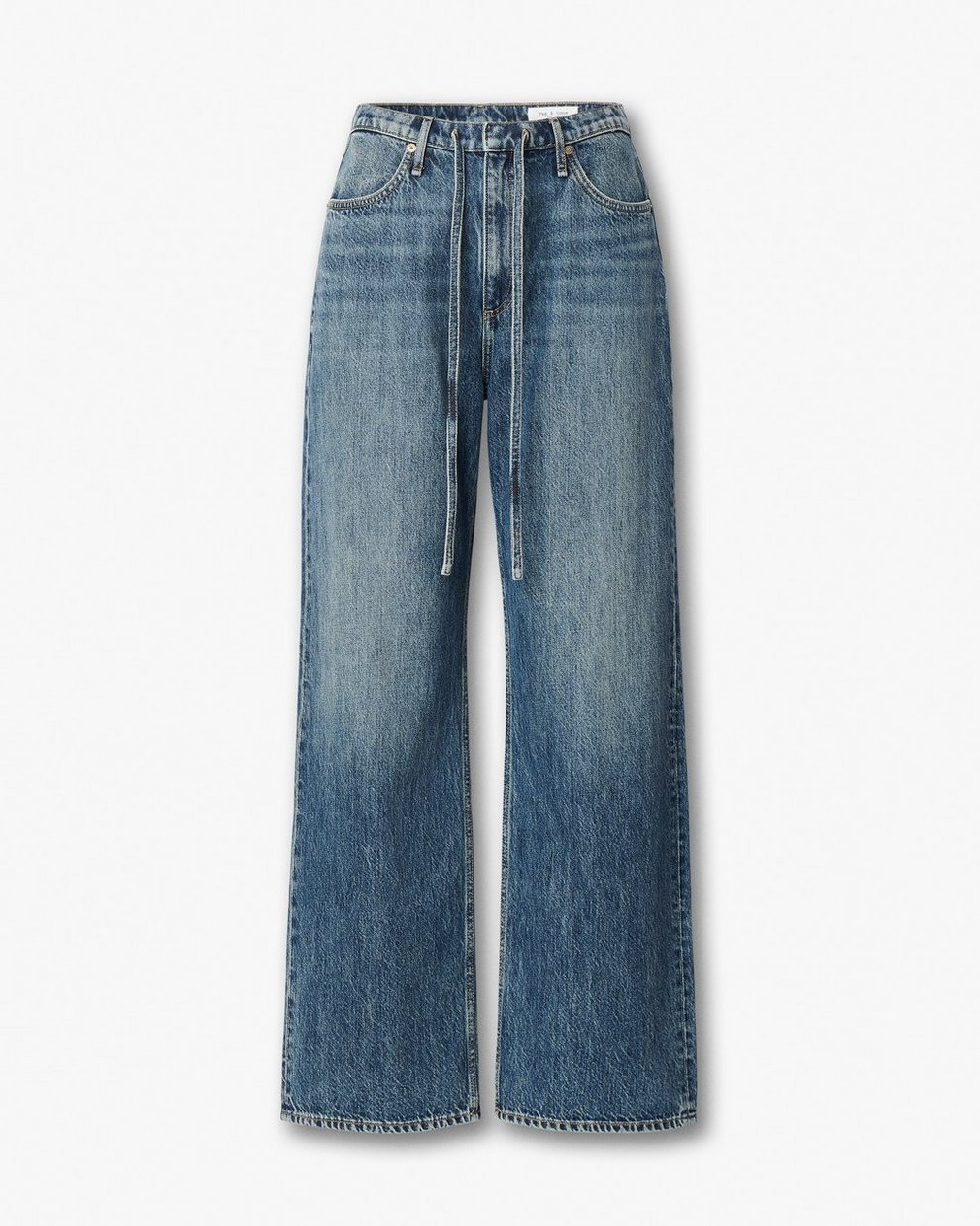 The Phoebe Drawstring Pants. Mid-rise jeans with a relaxed, laid-back fit and a drawstring waistband. Crafted from Lightweight Rigid non-stretch denim that provides structure, but breaks in over time for a soft and comfortable feel. In Delcan, a medium-dark indigo wash.