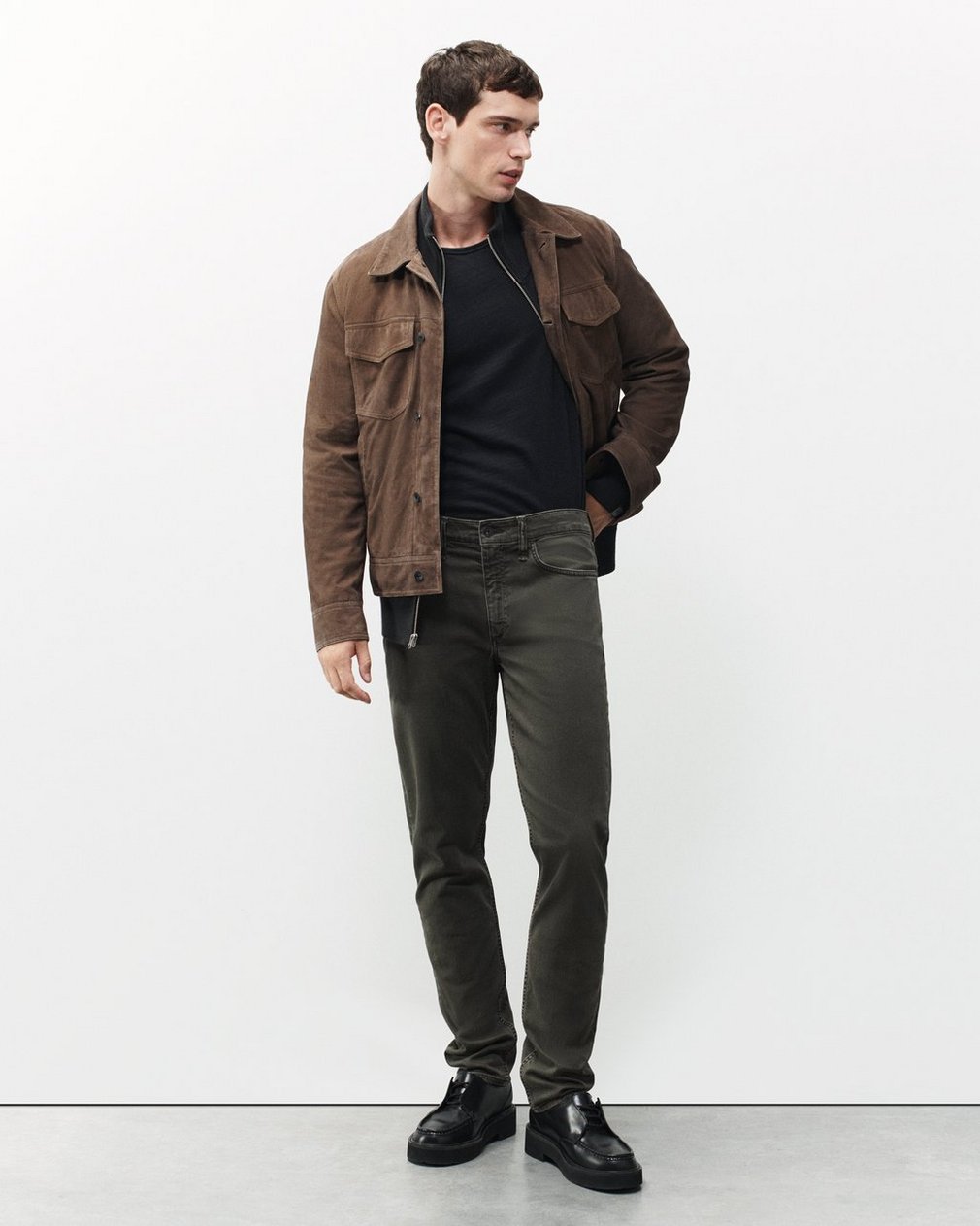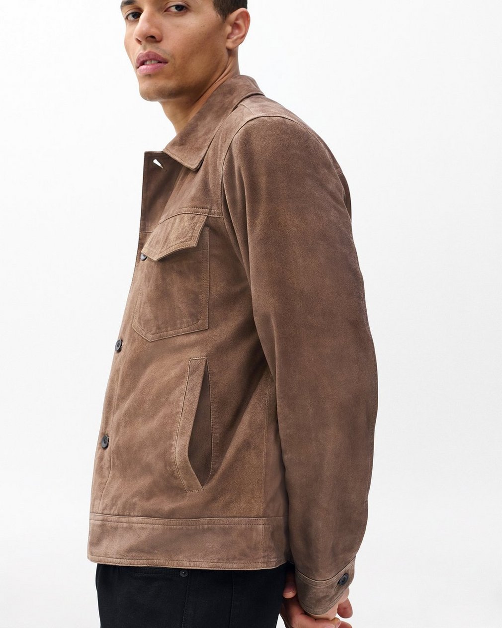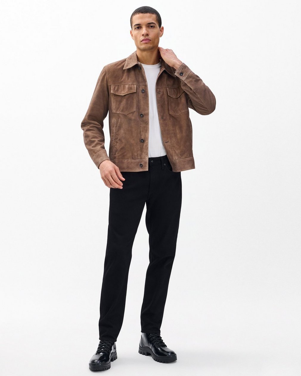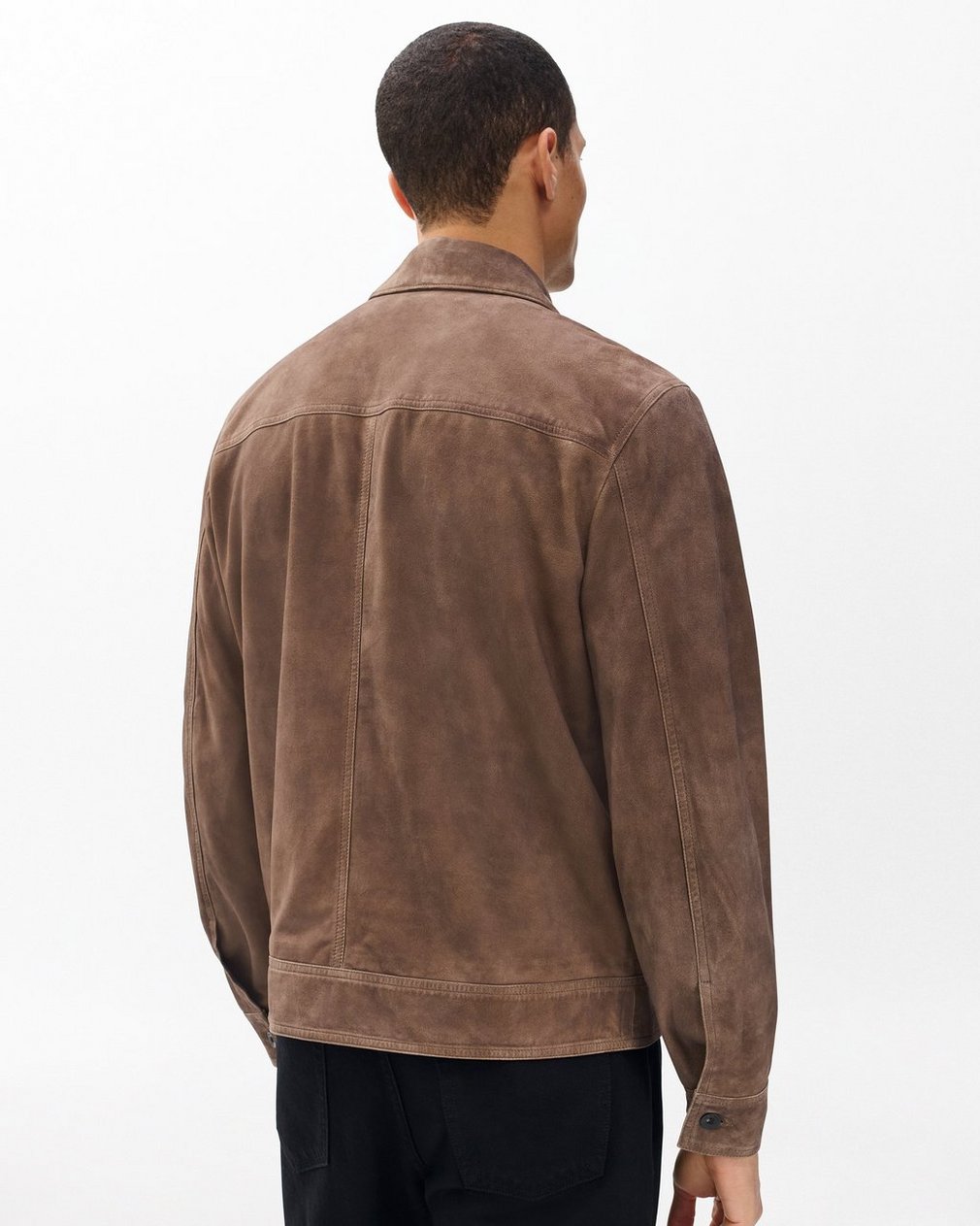 The denim trucker jacket, expertly reinterpreted in velvety suede and finished with our signature jacquard dagger-logo lining. This refined take on the Americana classic is dyed and washed to create a beautiful depth of color with nuanced highs and lows throughout.