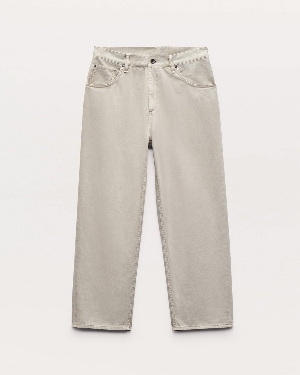 rbBAGGY. Our new perfectly oversized fit. Mid-rise, roomy through the hip and thigh, with a wide, subtly tapered leg. Cut from Authentic Rigid, a structured denim designed to break in, whisker, and fade over years of wear. In Aged Taupe, a light tan hue created through a garment-dyed process.