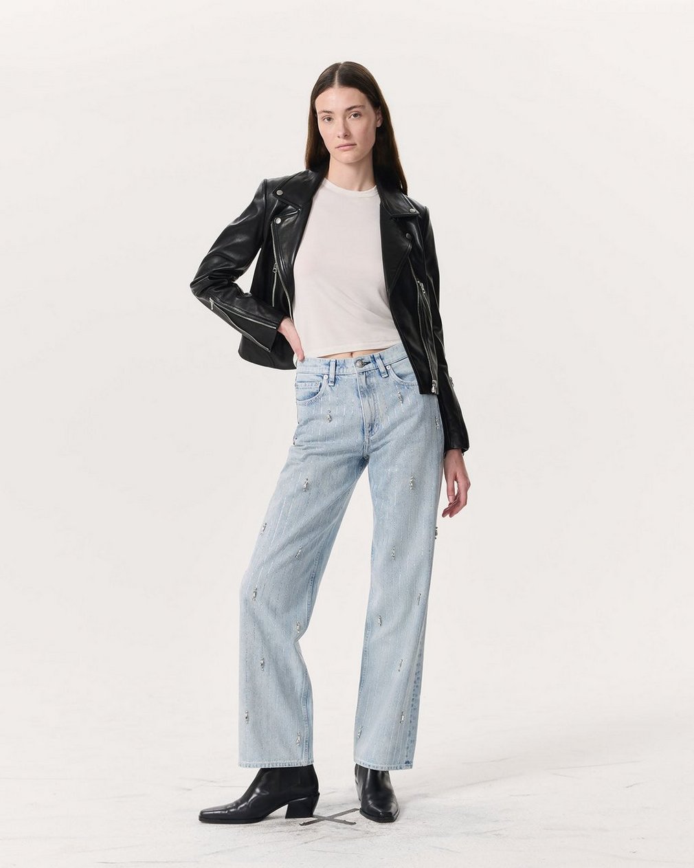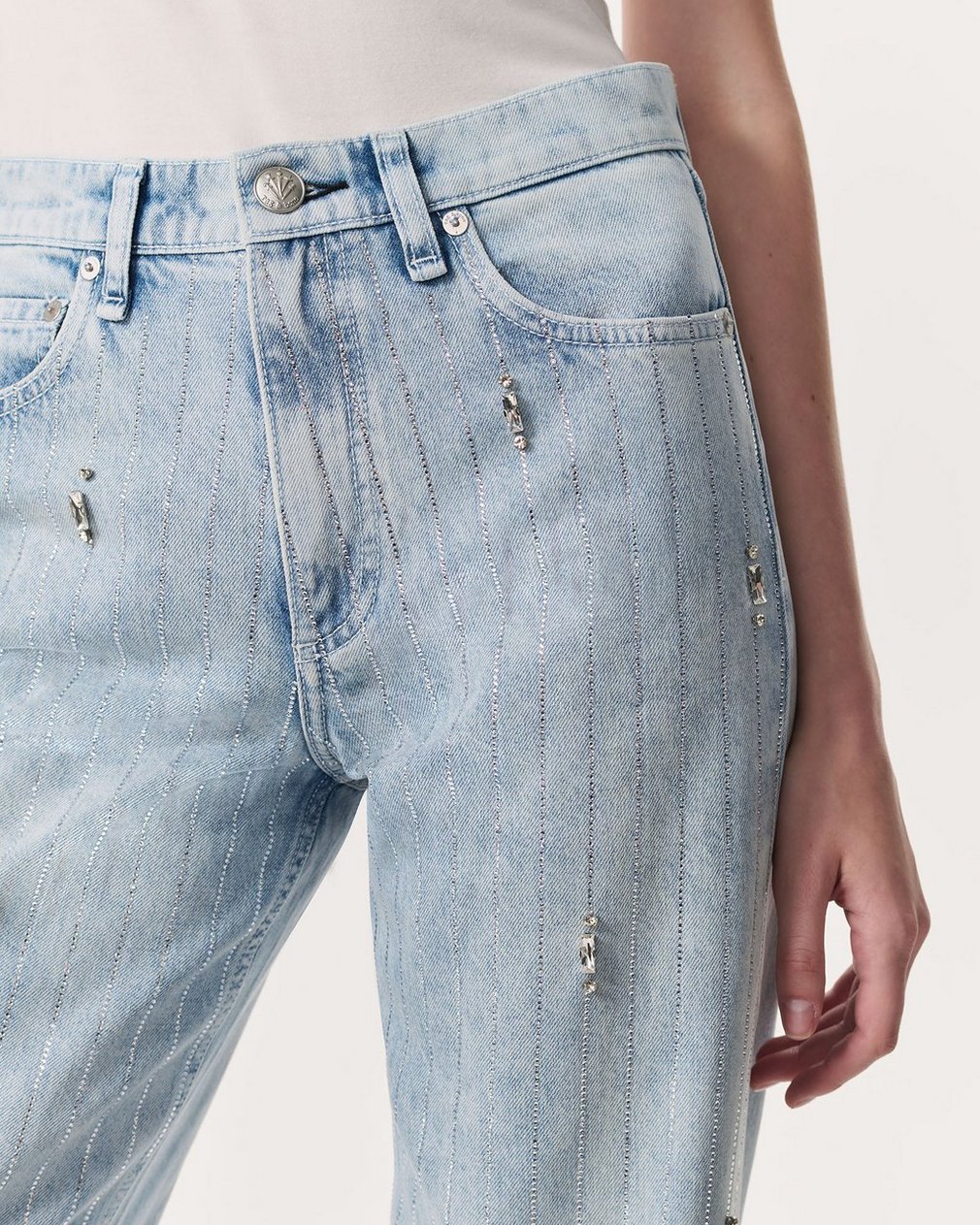 The Shea. Full-length high-rise jeans designed with relaxed, straight legs. Crafted from Lightweight Rigid non-stretch denim that provides structure, but breaks in over time for a soft and comfortable feel. In Aliah Jewel, a light indigo wash embellished with stripes and hand-sewn clusters of crystals.