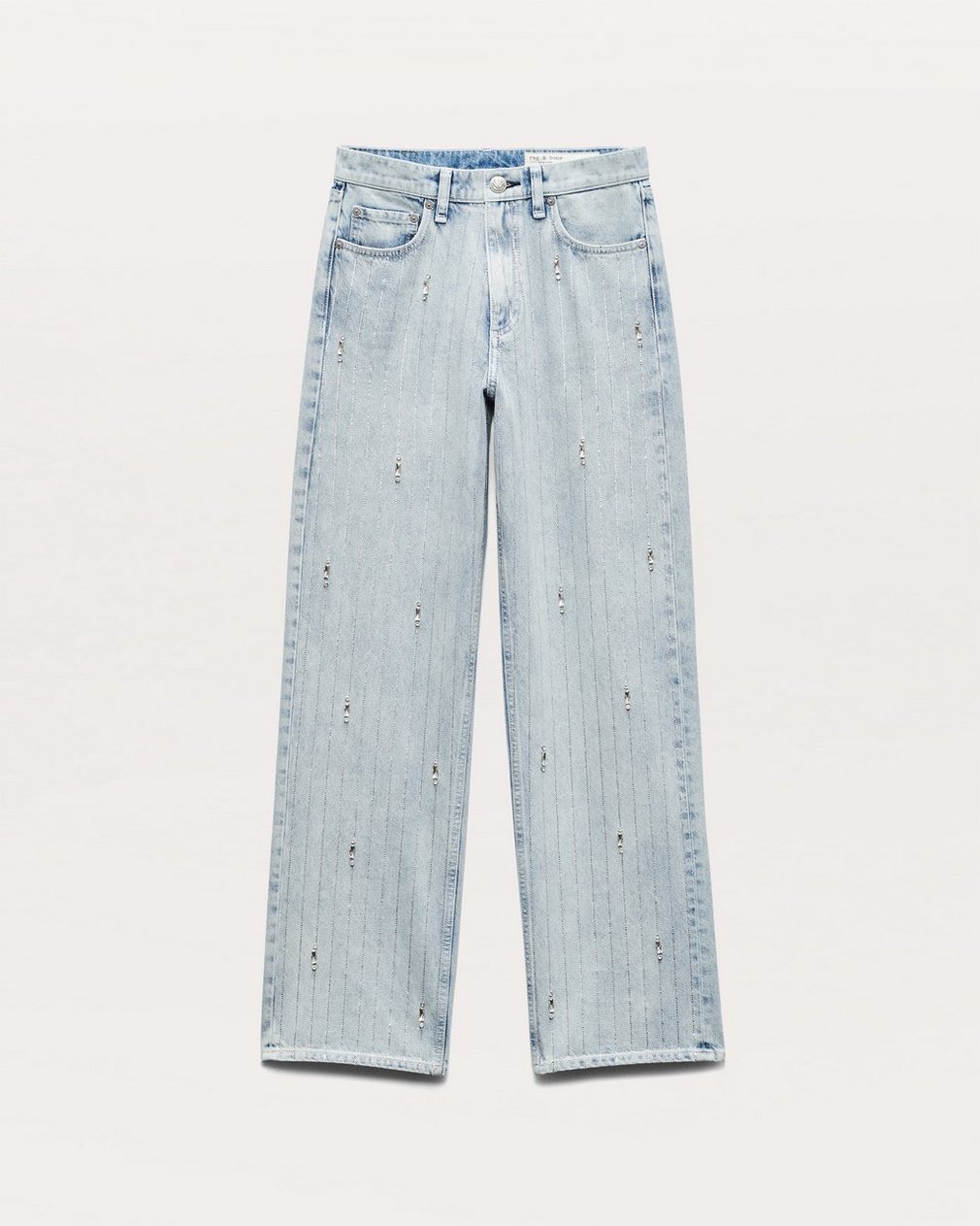 Lightweight Rigid Denim in Aliah Jewel, a light indigo wash embellished with stripes and hand-sewn clusters of crystals
