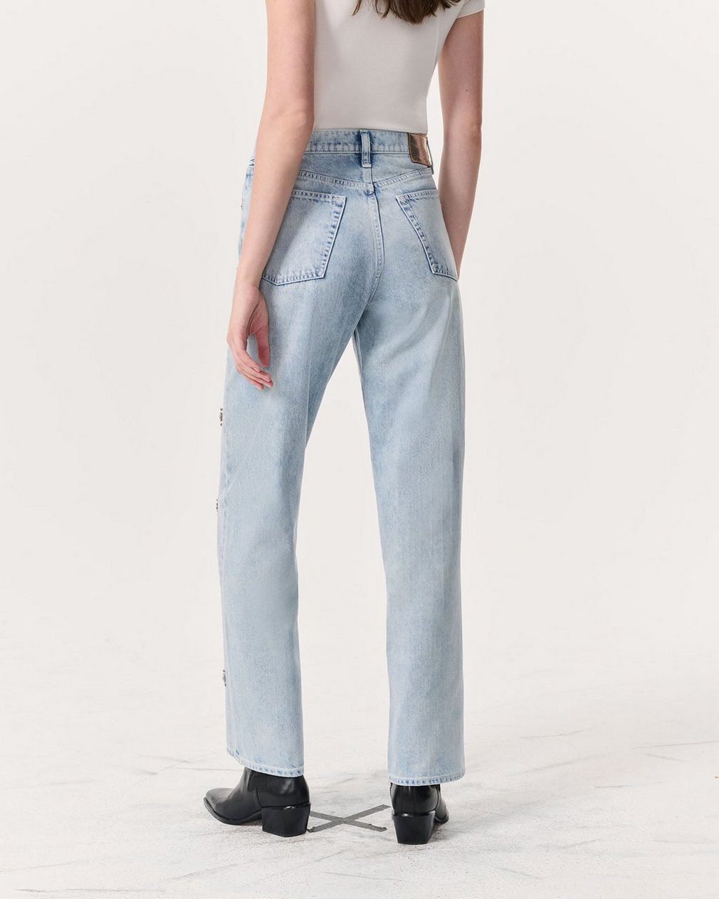 Signature dagger shank button at center front with a zipper fly, metal rivets