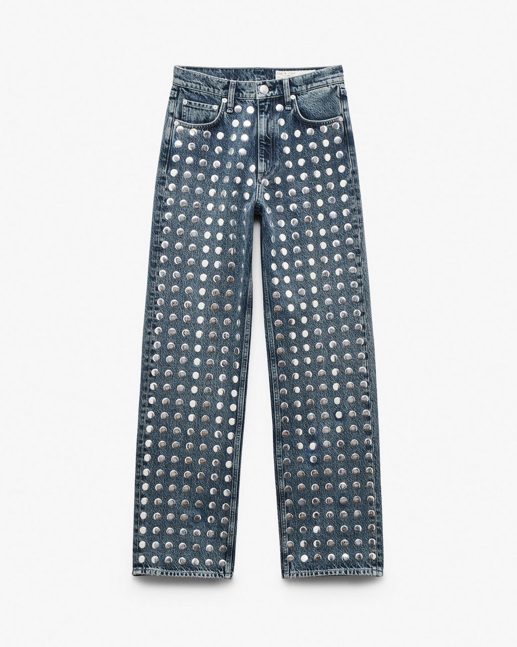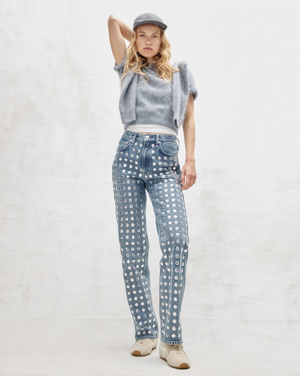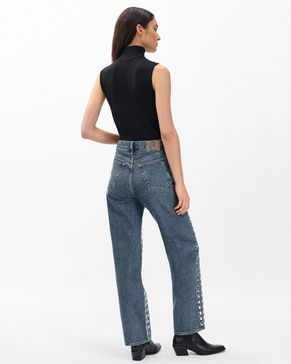 The Shea. High-rise jeans with a fitted waist and a relaxed, straight leg. An easy, everyday fit. Crafted from Lightweight Rigid non-stretch denim that provides structure, but breaks in over time for a soft and comfortable feel. In Studded Kingston, a medium-dark indigo wash with bold, heat-sealed domed studs down the front.