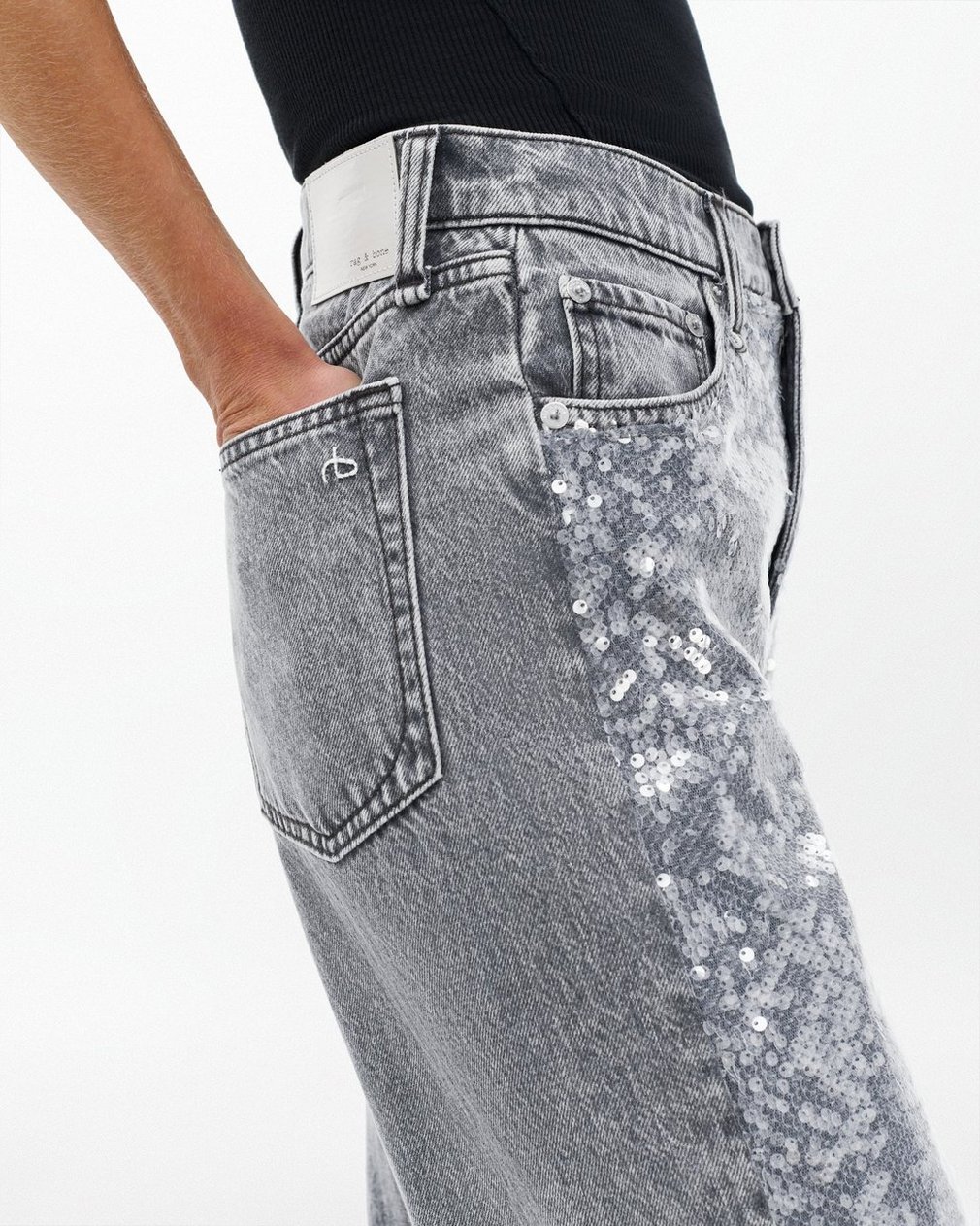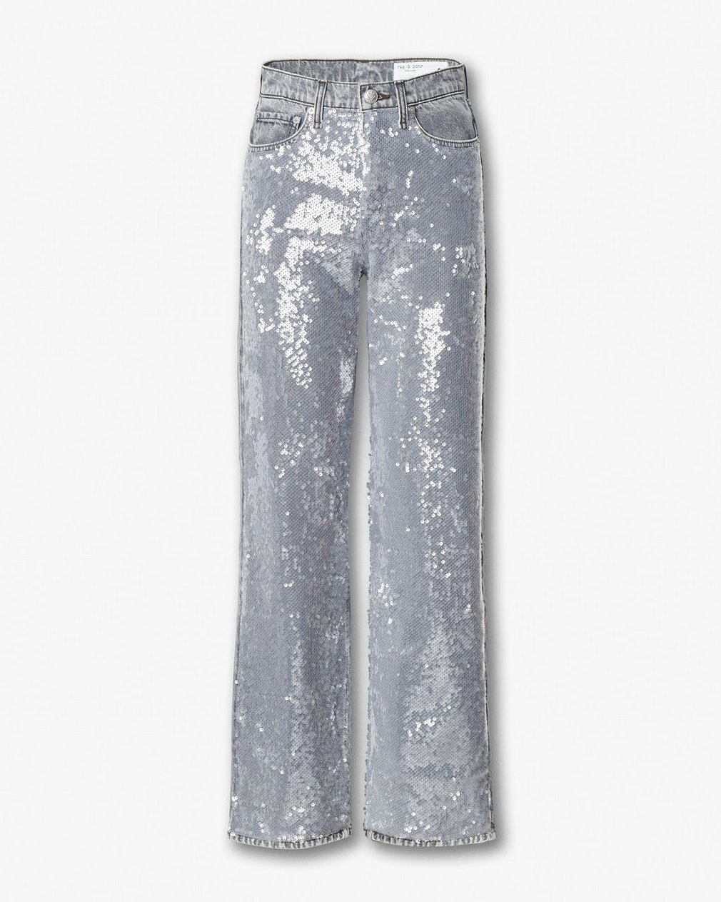 ? Lightweight Rigid Denim in Steele Sequins, a light-medium grey wash with tonal sequins down the front for a festive, holiday look