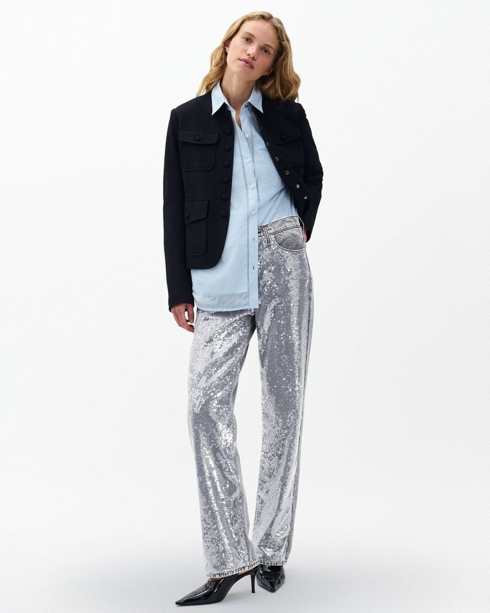 The Shea. High-rise jeans with a fitted waist and a straight leg that falls past the ankle. Crafted from Lightweight Rigid non-stretch denim that provides structure, but breaks in over time for a soft and comfortable feel. In Steele Sequins, a light-medium grey wash with tonal sequins down the front for a festive, holiday look.