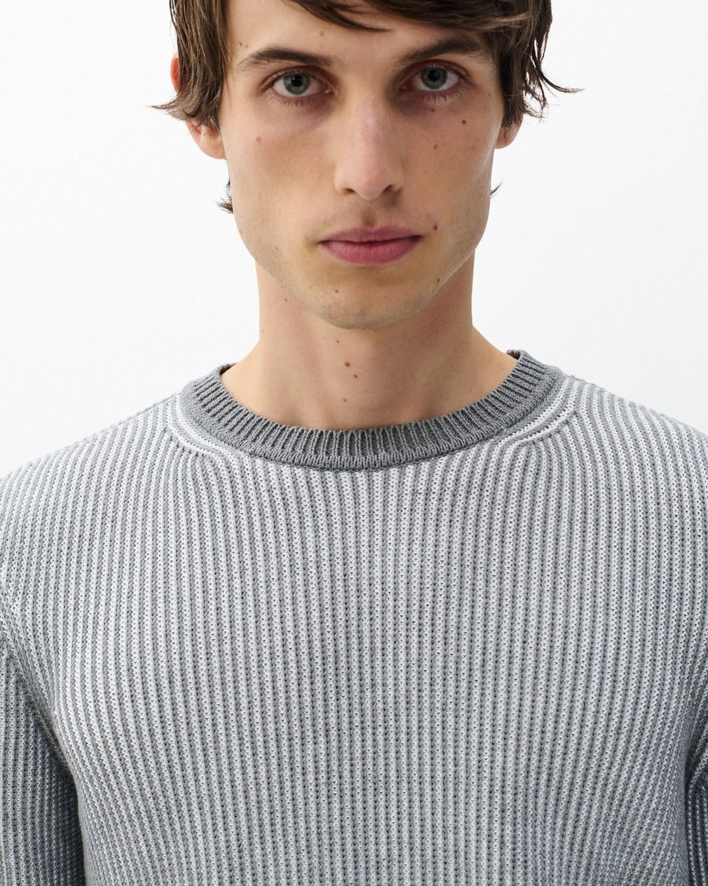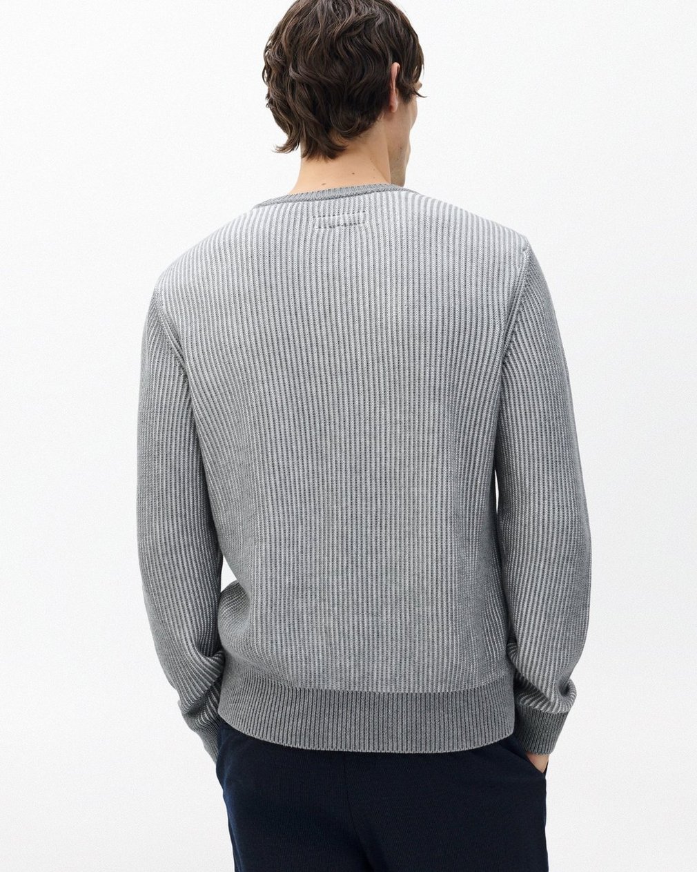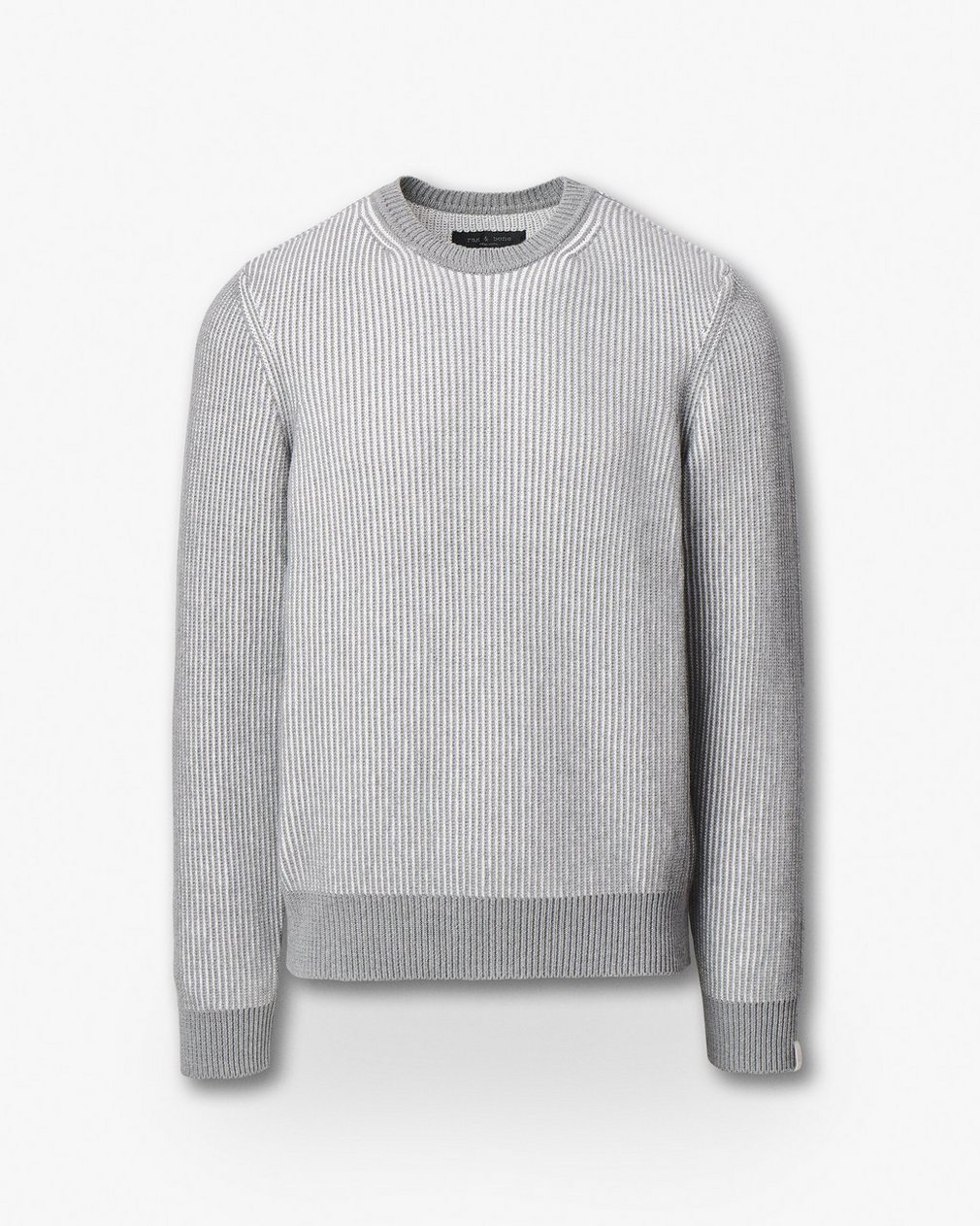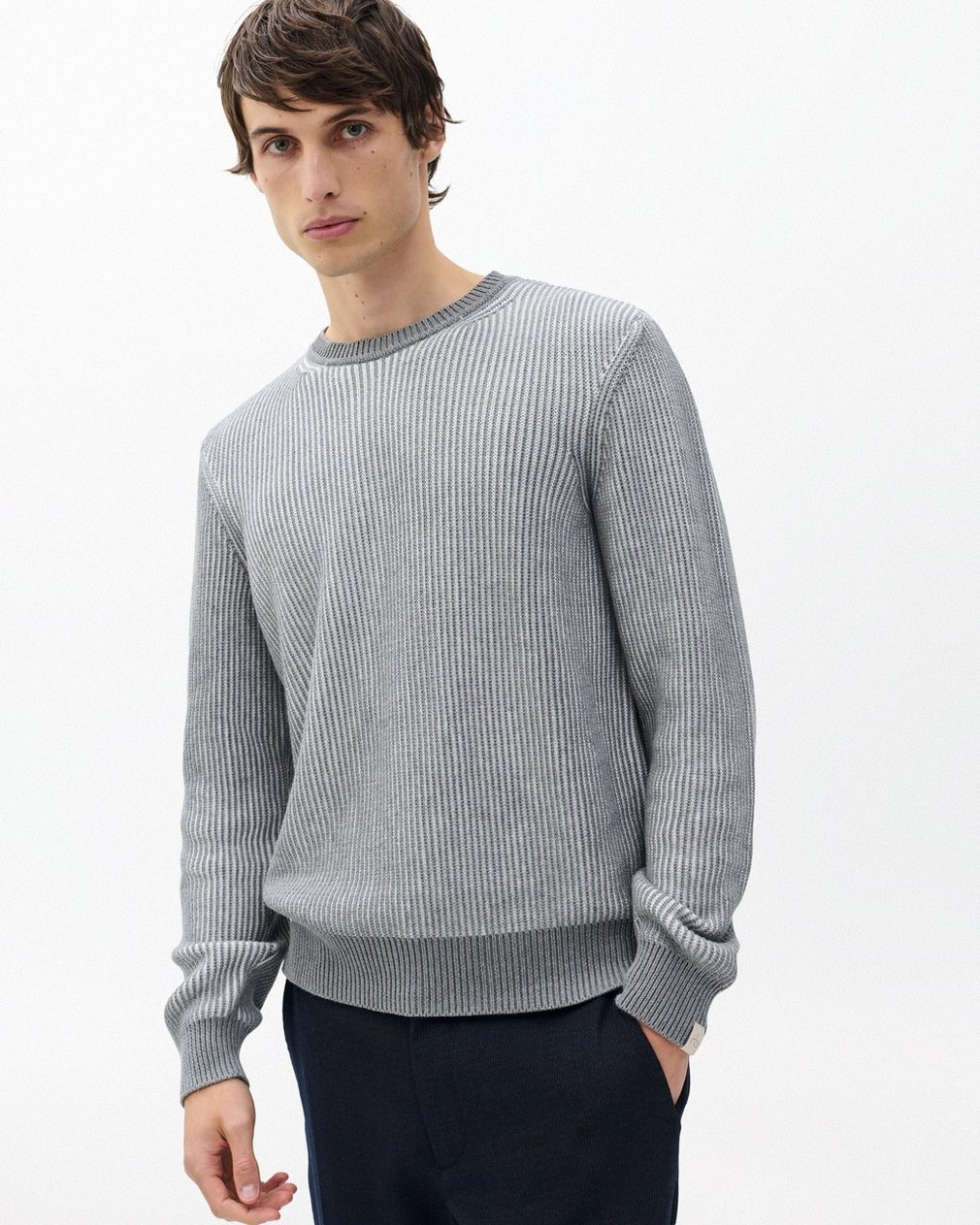 Depth and dimension. Knit from soft cotton yarns, this crewneck sweater features textured stitches in two tones that form graphic marled stripes. Solid trims frame the look with a clean finish. Pairs effortlessly with dark denim or pared-back chinos.
