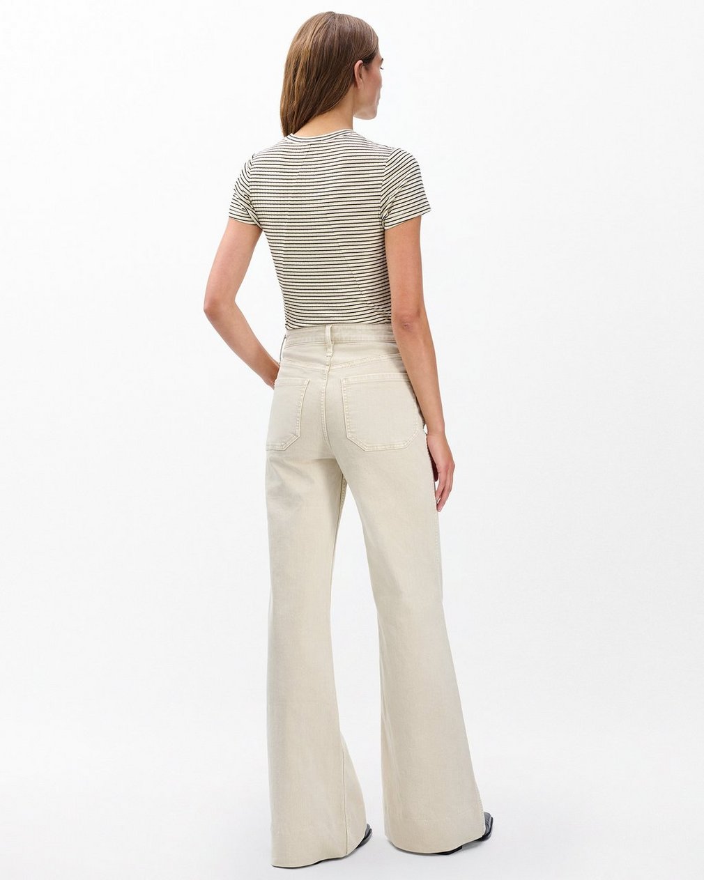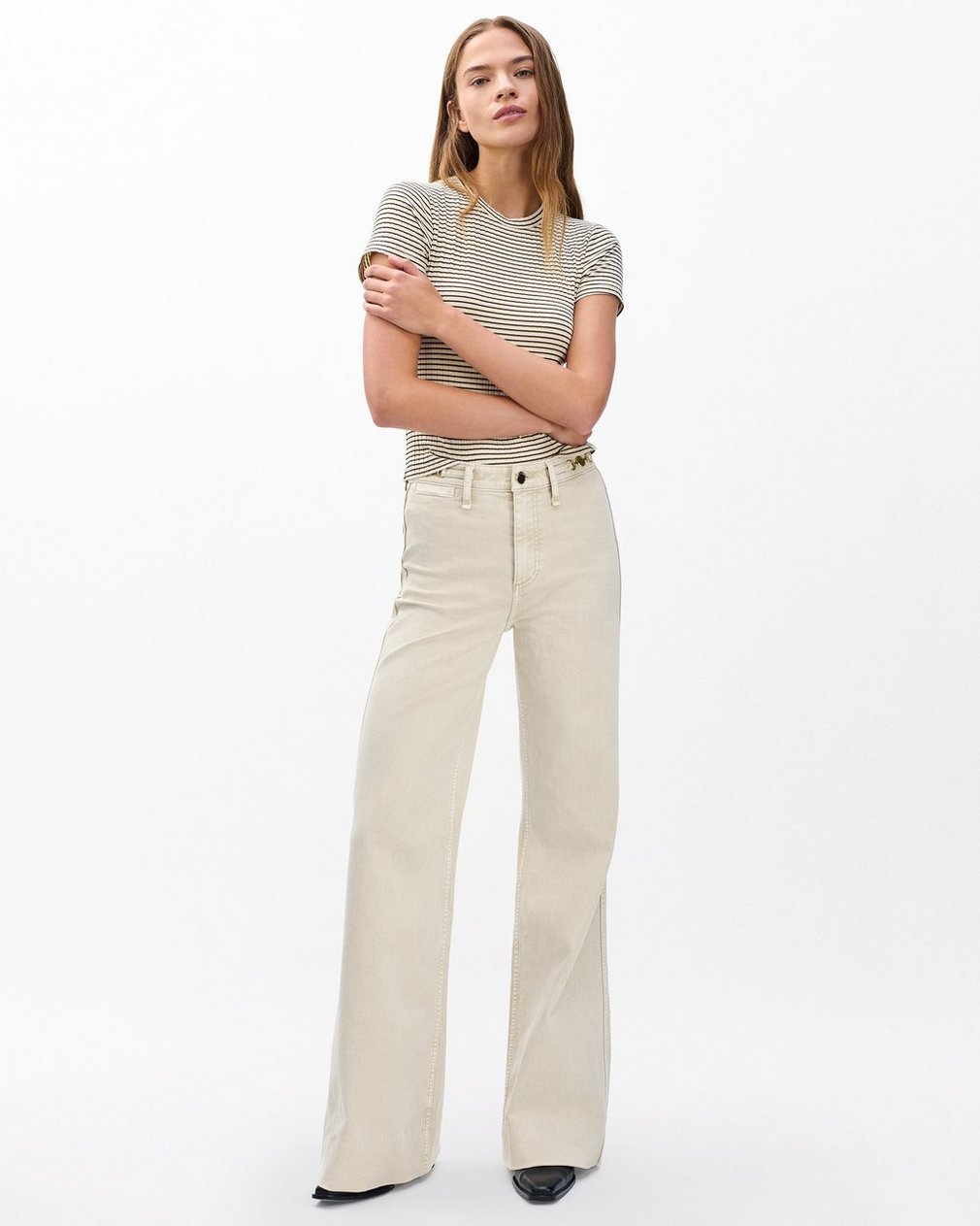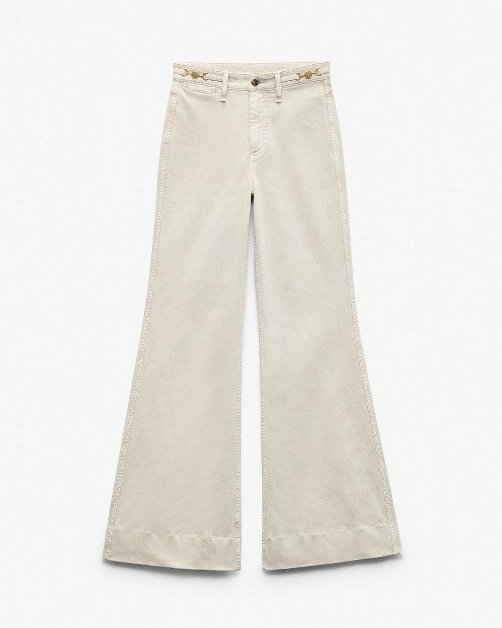 The Skylar. Standout trouser-style jeans with a high rise and roomy legs that gradually open into super-wide, flared hems. Signature metal horsebit accents at the waist further dial up its distinction. Crafted from our Vintage Stretch denim for a broken-in look & feel with a comfortable touch of stretch. In Sandstone, a muted light beige wash.