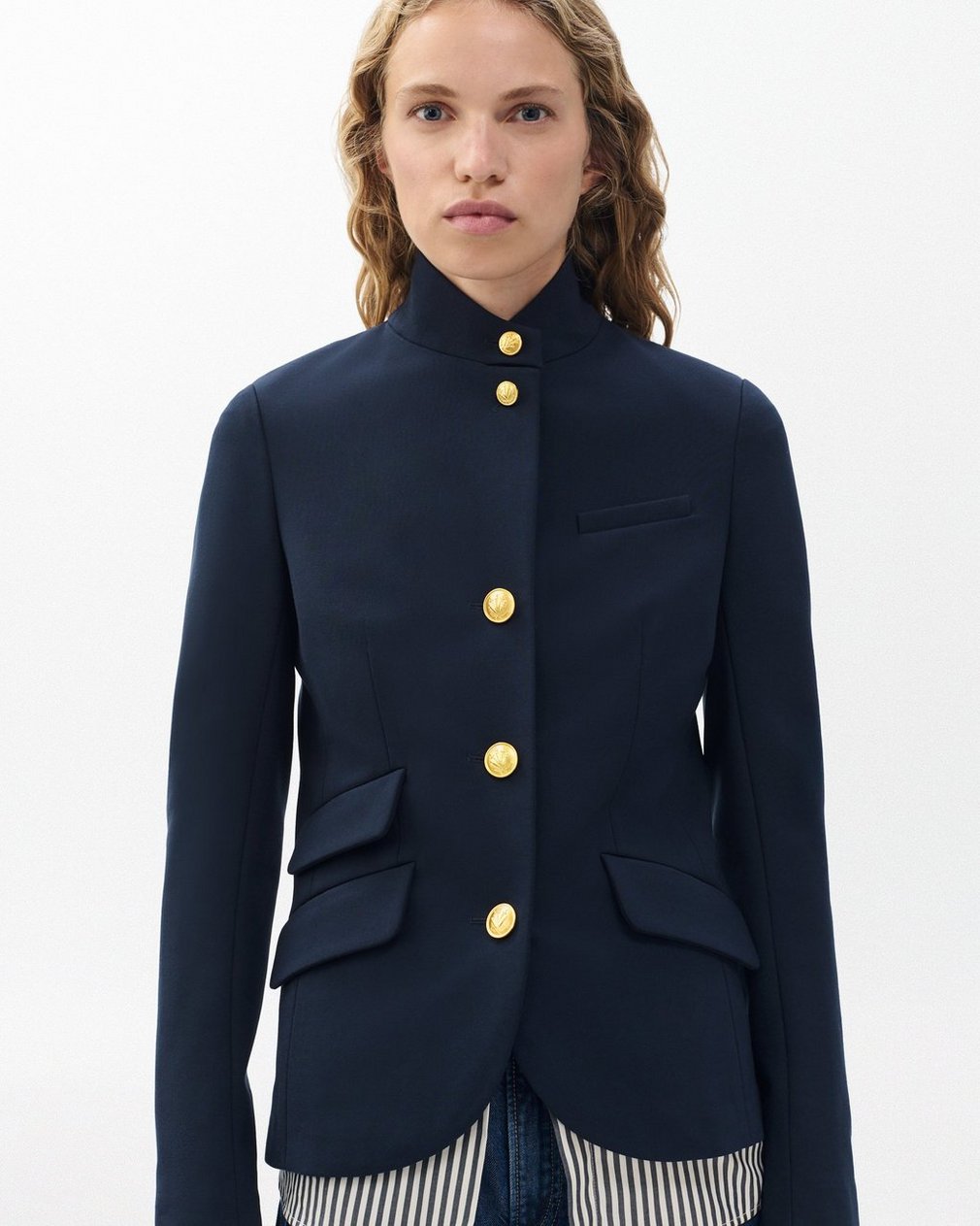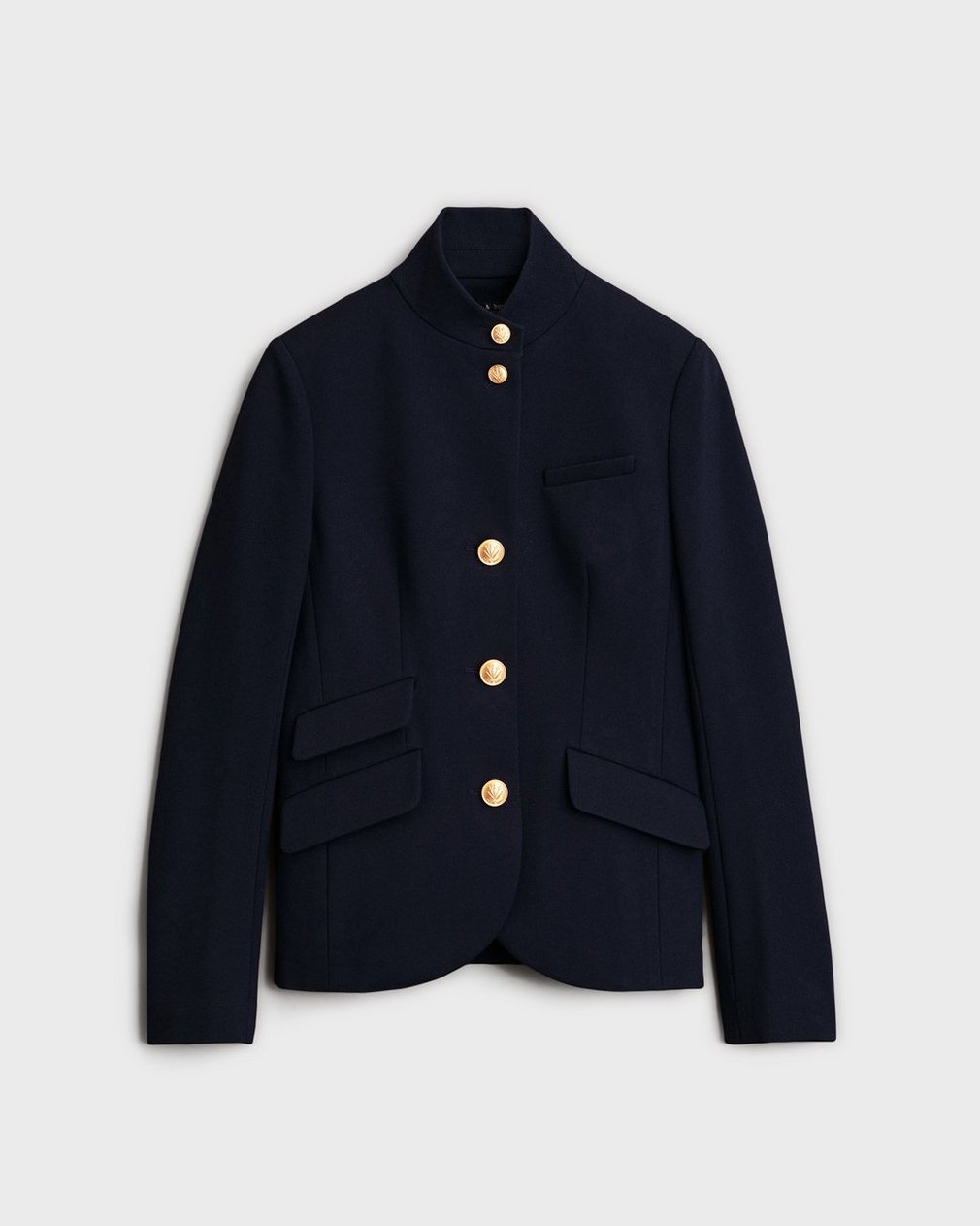 ? Signature dagger buttons at center front and sleeve opening