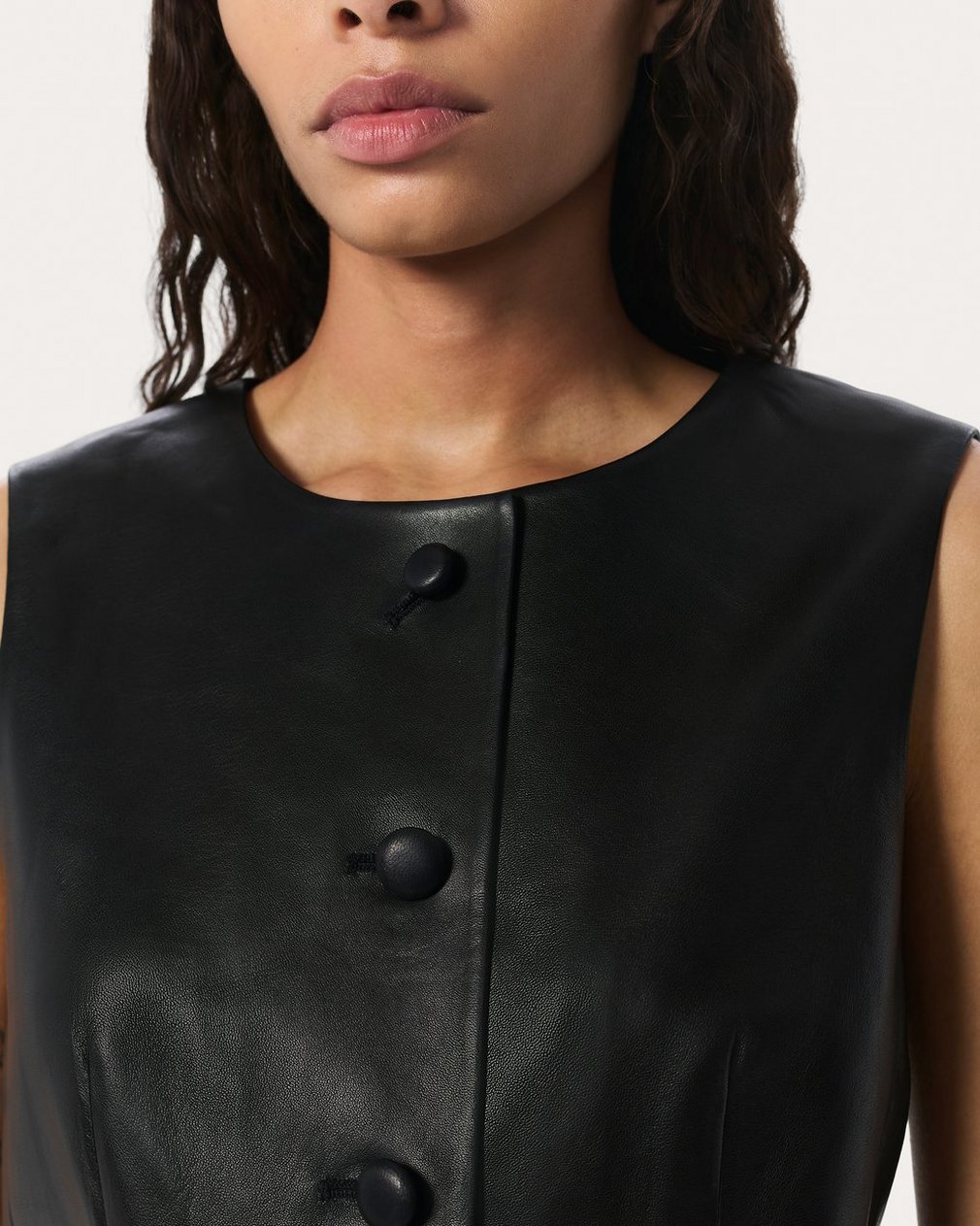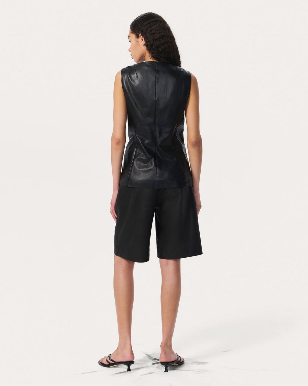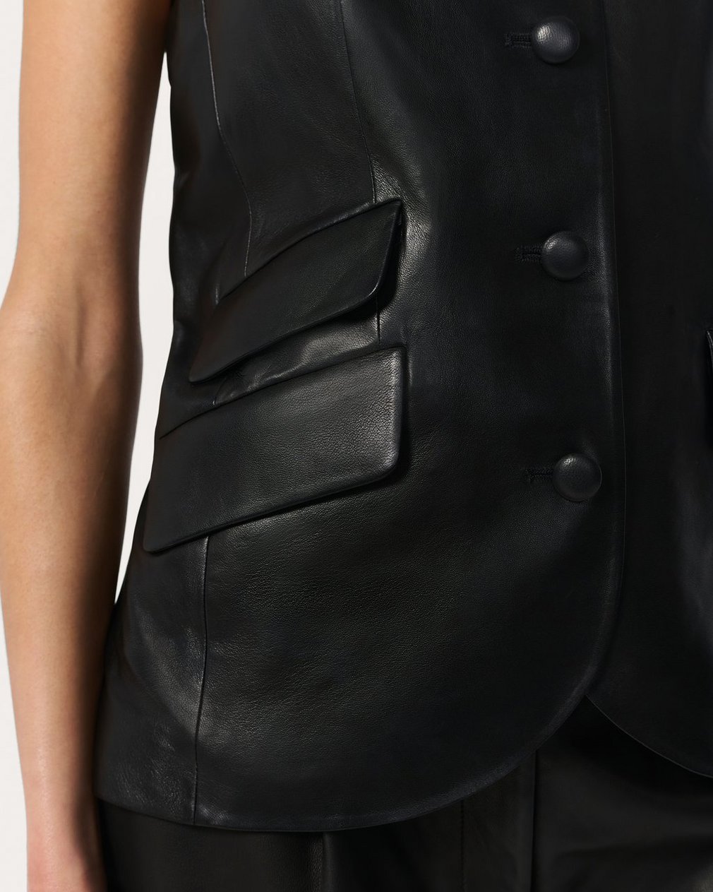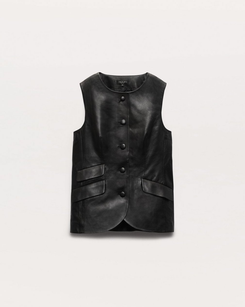 The iconic rag & bone Slade blazer, reimagined as a vest. Expertly crafted from buttery lamb leather. Featuring a stand collar and a ticket pocket, this fully lined, slim-fit style perfectly blends the refinement of a blazer with the utility of a military jacket. Complete with leather-wrapped buttons down the center front. Pair with the matching Irina Leather Shorts and heels for a luxe summer look, or pare it back with breezy beach pants and sandals.