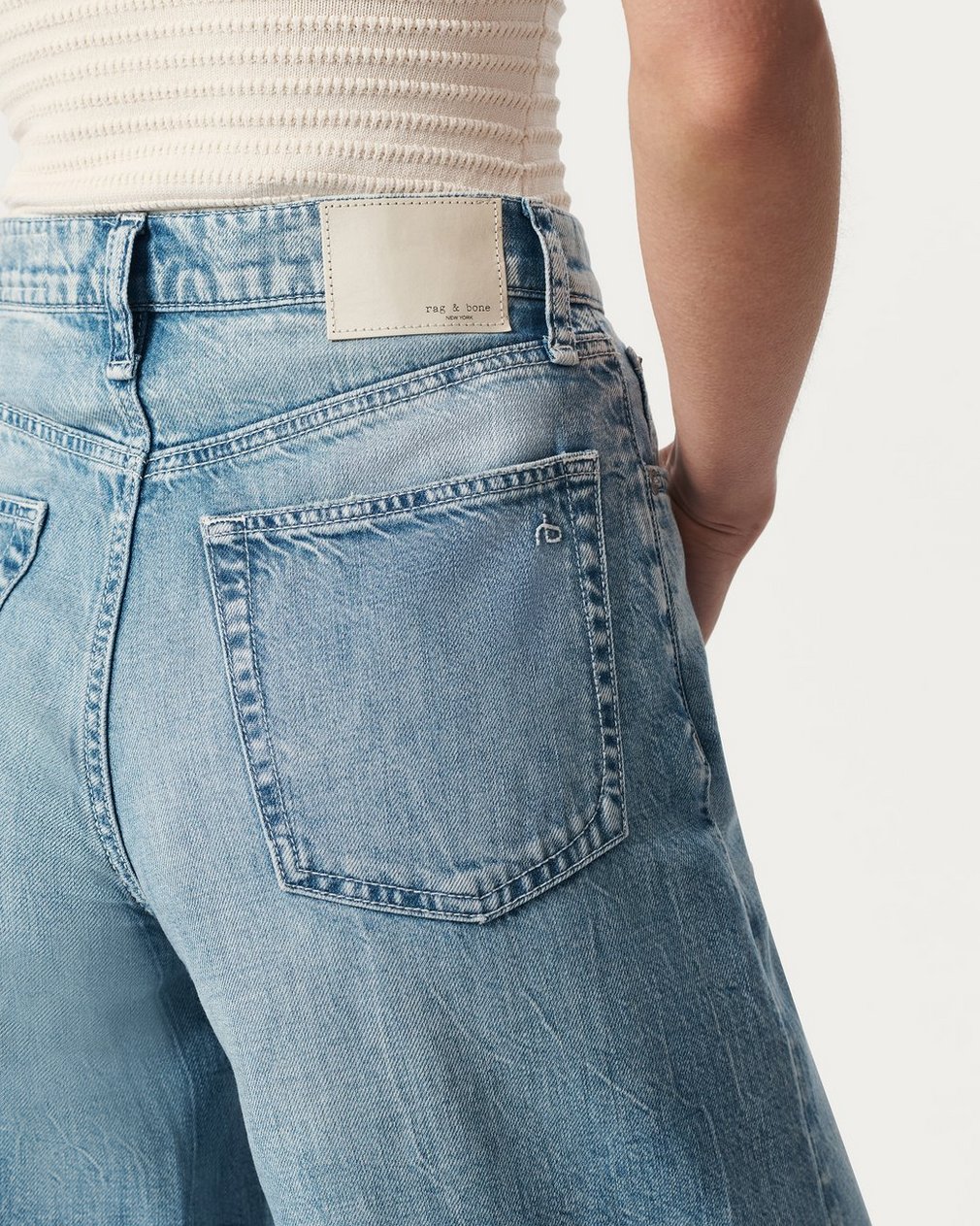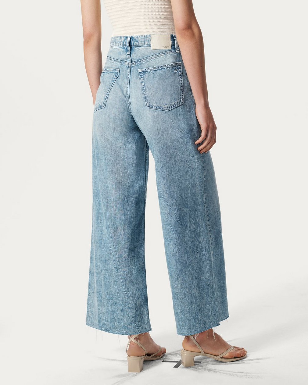 The Sofie. High-rise jeans with super-wide cropped legs that are rag & bone office favorites. Crafted from our Featherweight denim that’s supremely soft and super light, with an easy drape. Feels airy & effortless. In Mira, a light indigo wash with a cut hem.