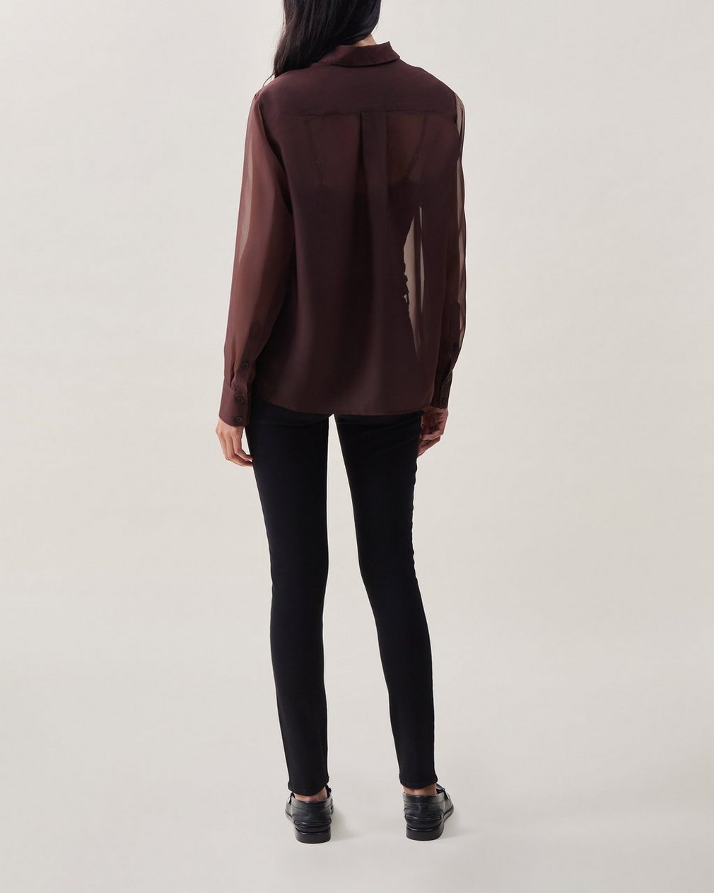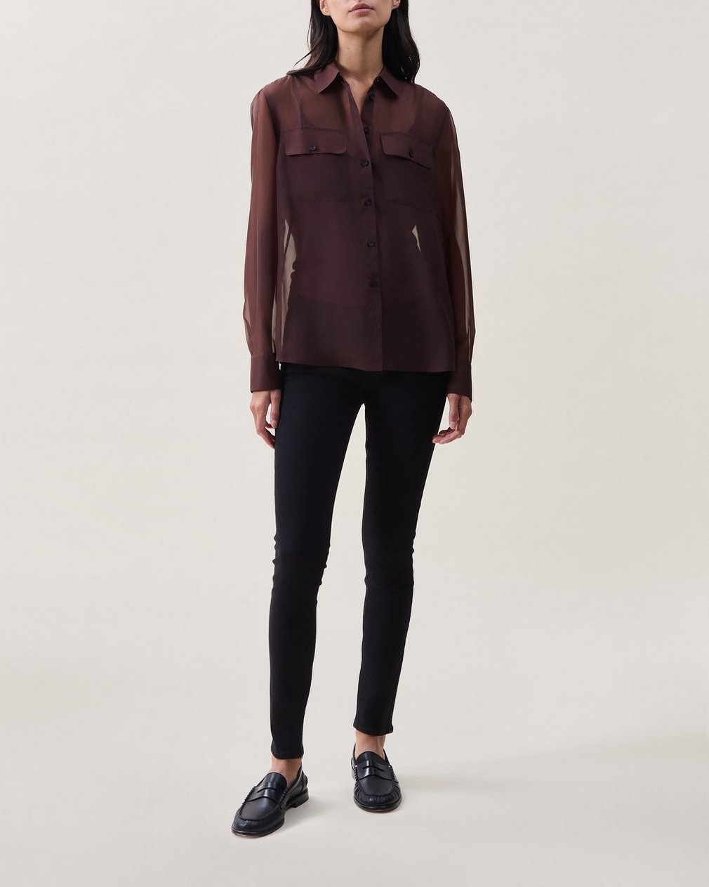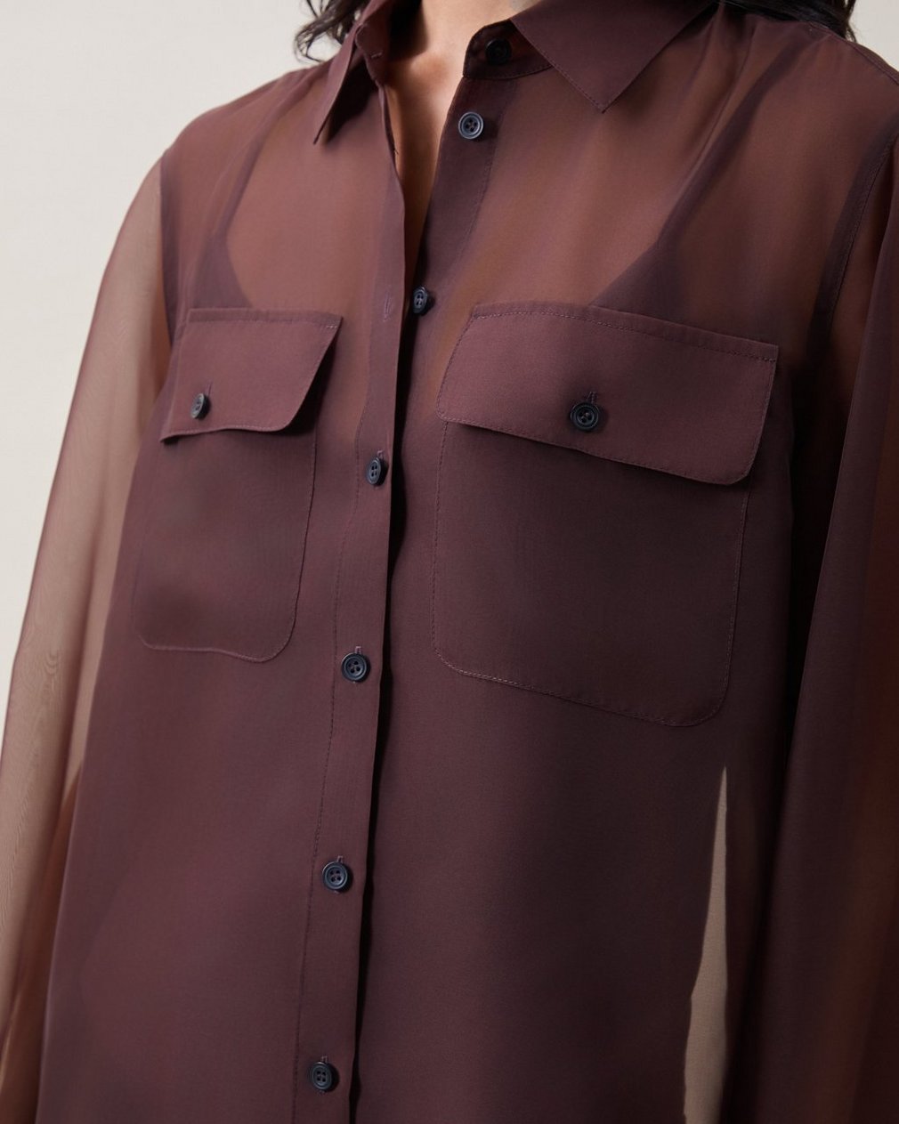 Light as air. This semi-sheer organza shirt reinterprets a classic button-up silhouette with a soft structure and a fluid, elegant look. A removable stretchy cami with baby snaps and adjustable straps can line this style for a simple, second layer.