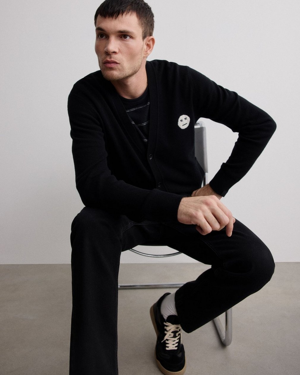 From the archive. Back with new expression. First hand-sketched in 2014, Sour Face is our deadpan ode to New York: sharp, unfazed, and running on caffeine and grit. No logos. No drama. Just clean lines, solid craft, and a bit of attitude. Knit on this classic fit cardigan in 100% wool.