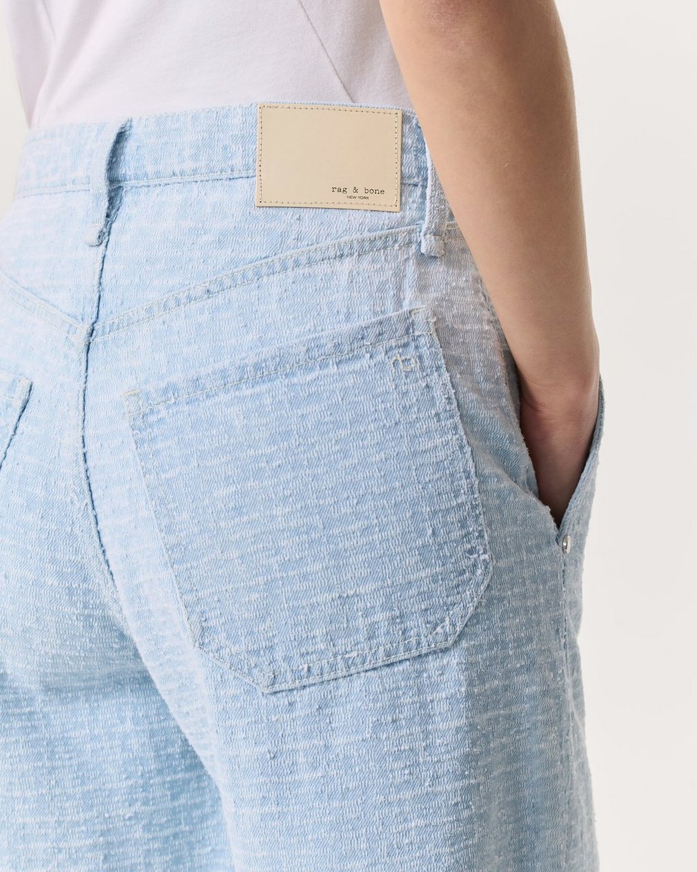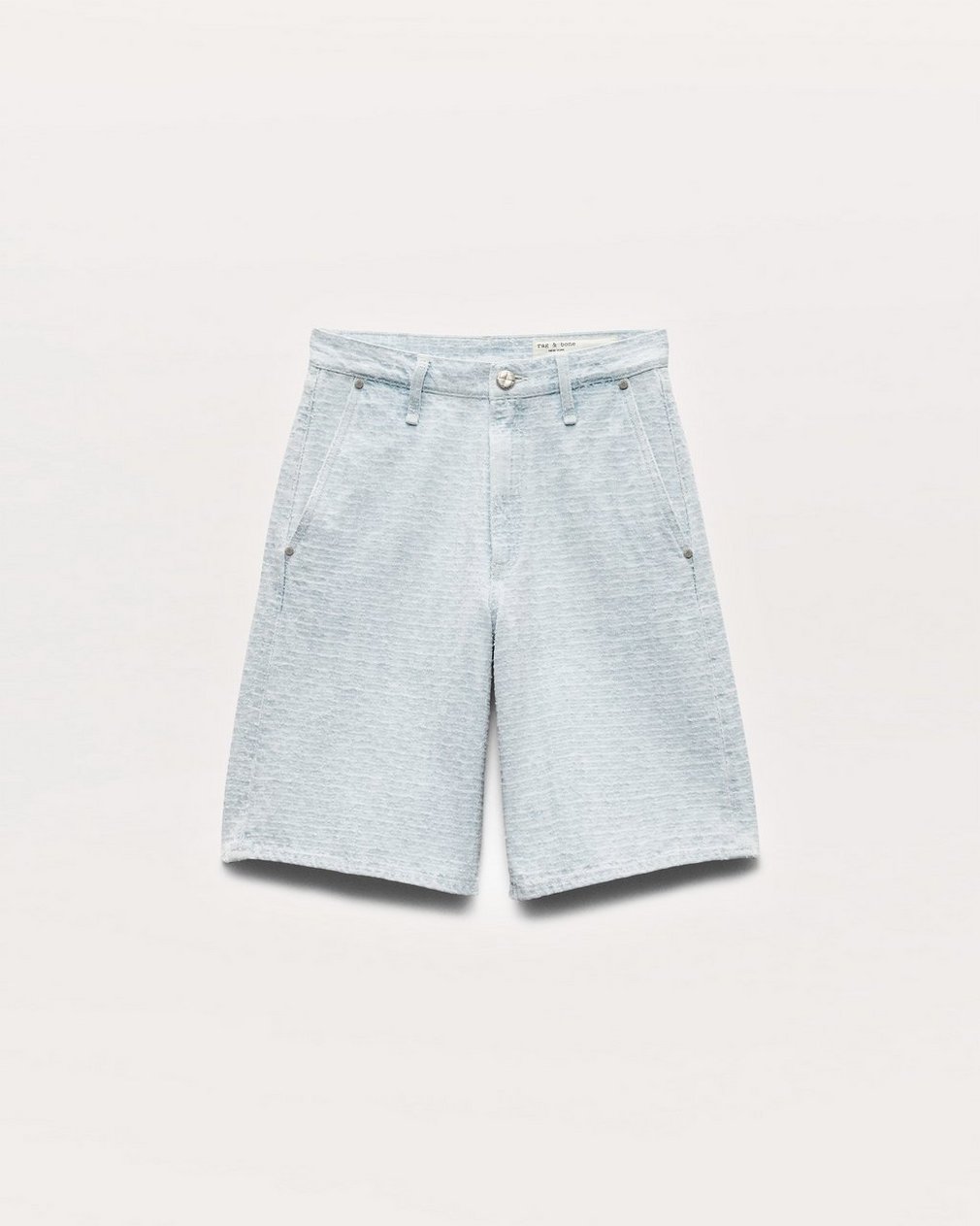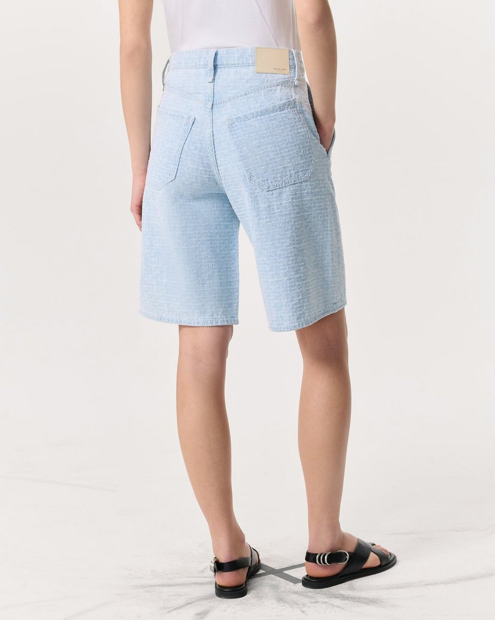 The Tailored McKenna Short. A dressier take on high-rise Bermuda shorts with a relaxed fit, 10.5″ inseam, and front slant pockets. Crafted from Lightweight Rigid non-stretch denim that provides structure, but breaks in over time for a soft and comfortable feel. In Sky Blue Tweed, a pale blue with an allover tweed-inspired texture.