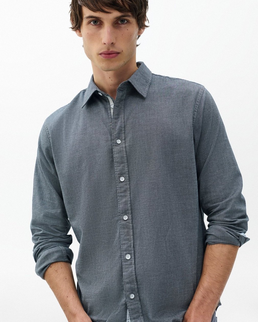 We updated our signature shirt in cotton dobby woven with a comfortable touch of stretch and the subtle texture of a small geometric pattern. Pair yours with an all-black look, or layer with denim for subtle contrast.