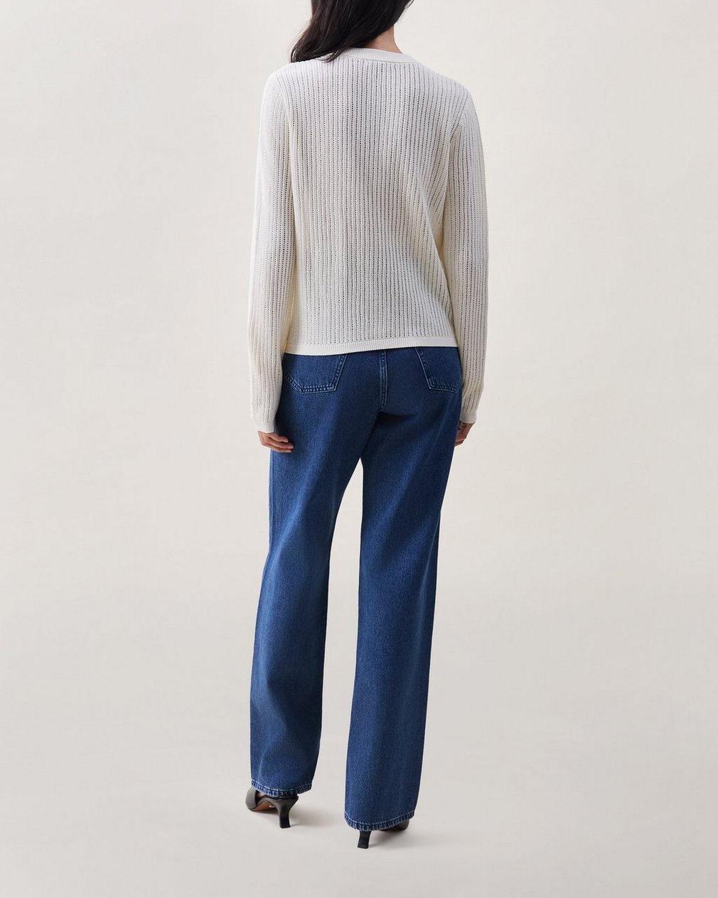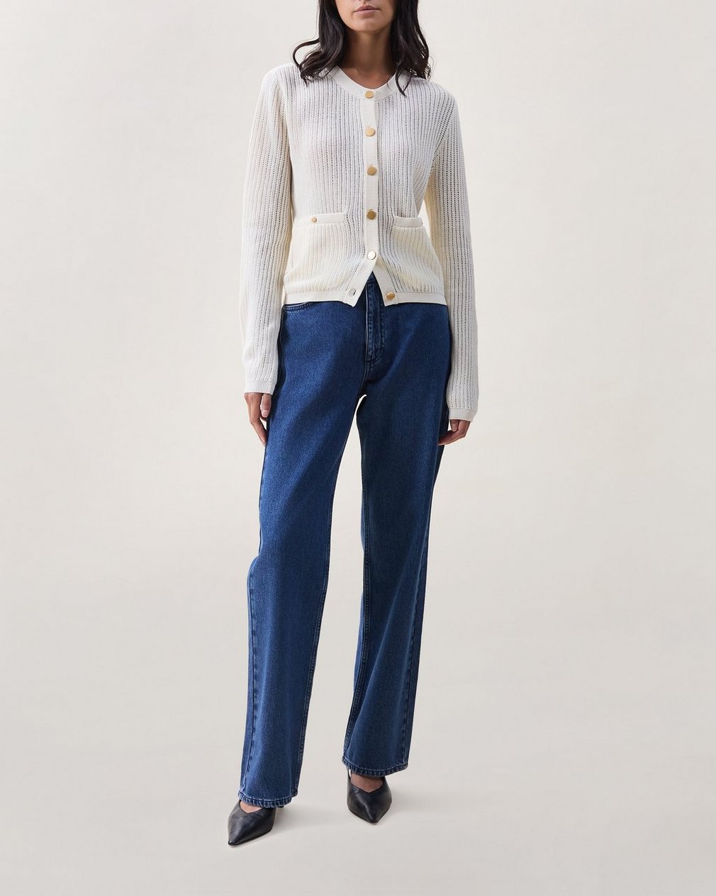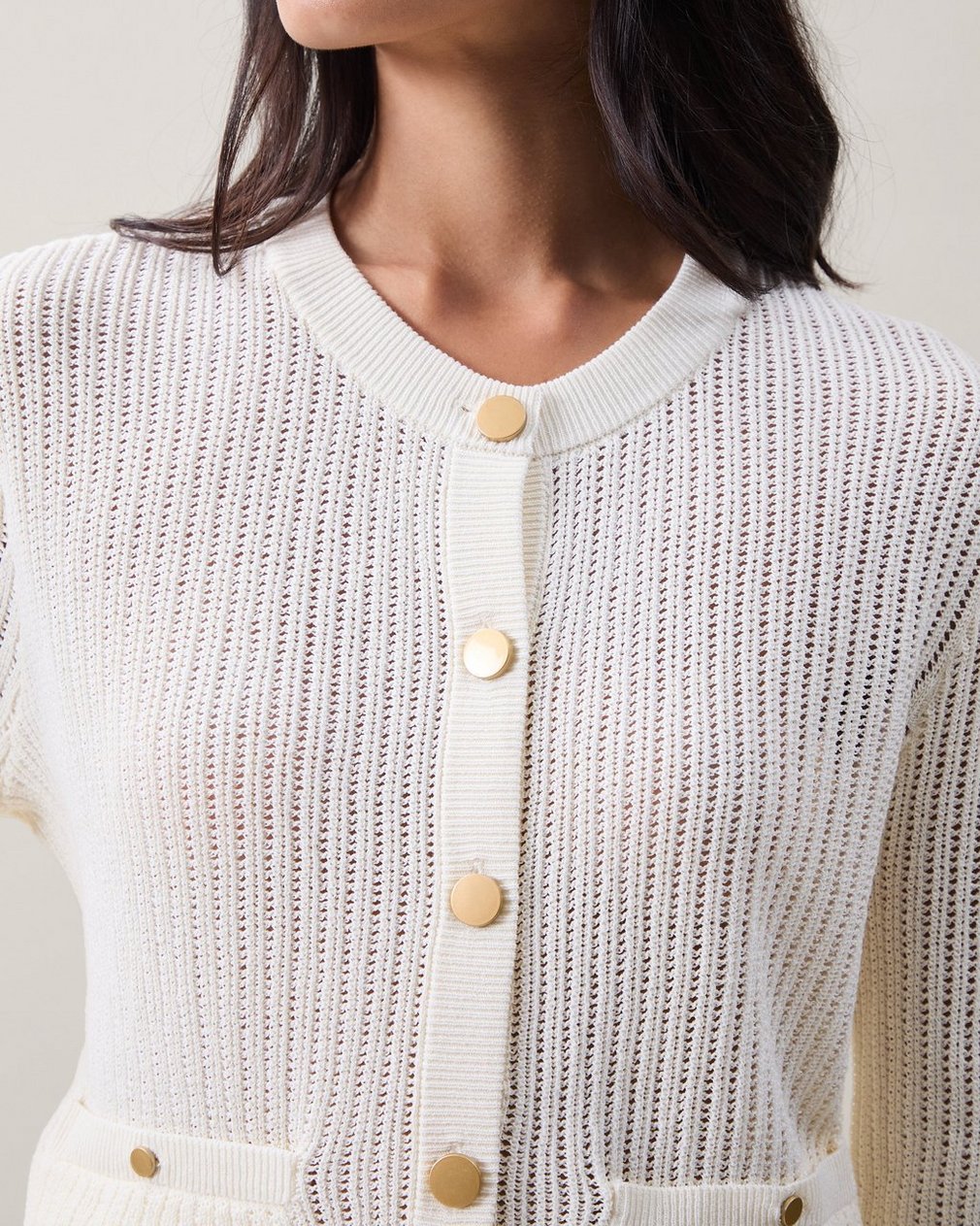 Lightweight layering. Crafted from a soft cotton blend, this cardigan features a subtly open-knit texture for breathability and ease. Designed with a classic crew neckline, it’s finished with front patch pockets and flat metal buttons. Wear it solo or over a tee.