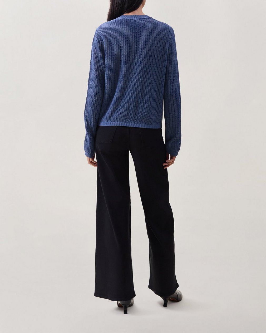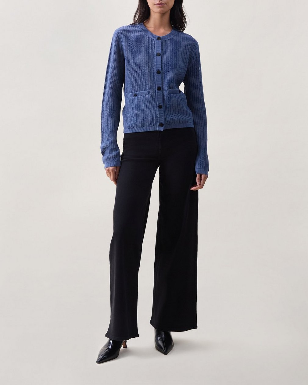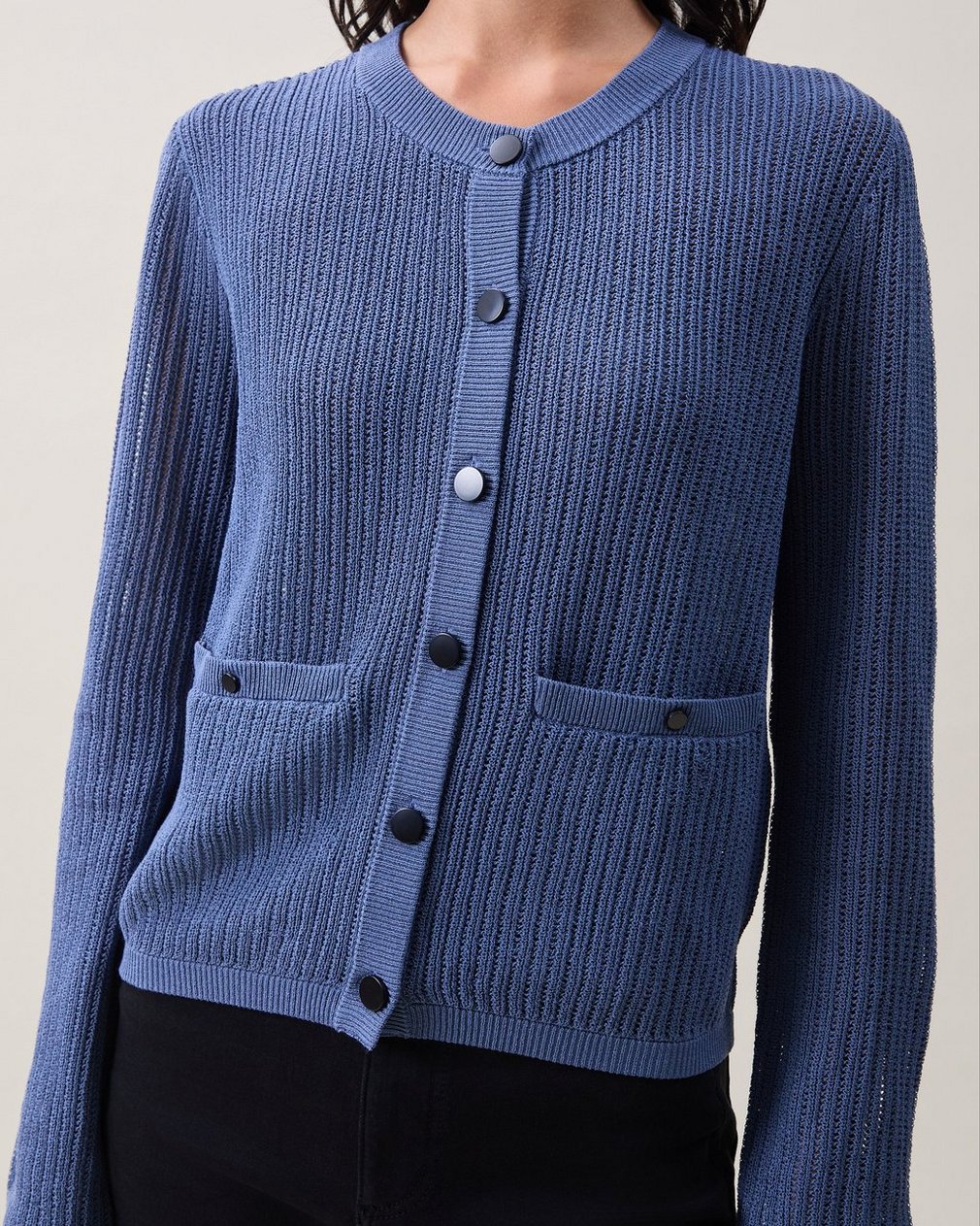 Lightweight layering. Crafted from a soft cotton blend, this cardigan features a subtly open-knit texture for breathability and ease. Designed with a classic crew neckline, it’s finished with front patch pockets and flat metal buttons. Wear it solo or over a tee.