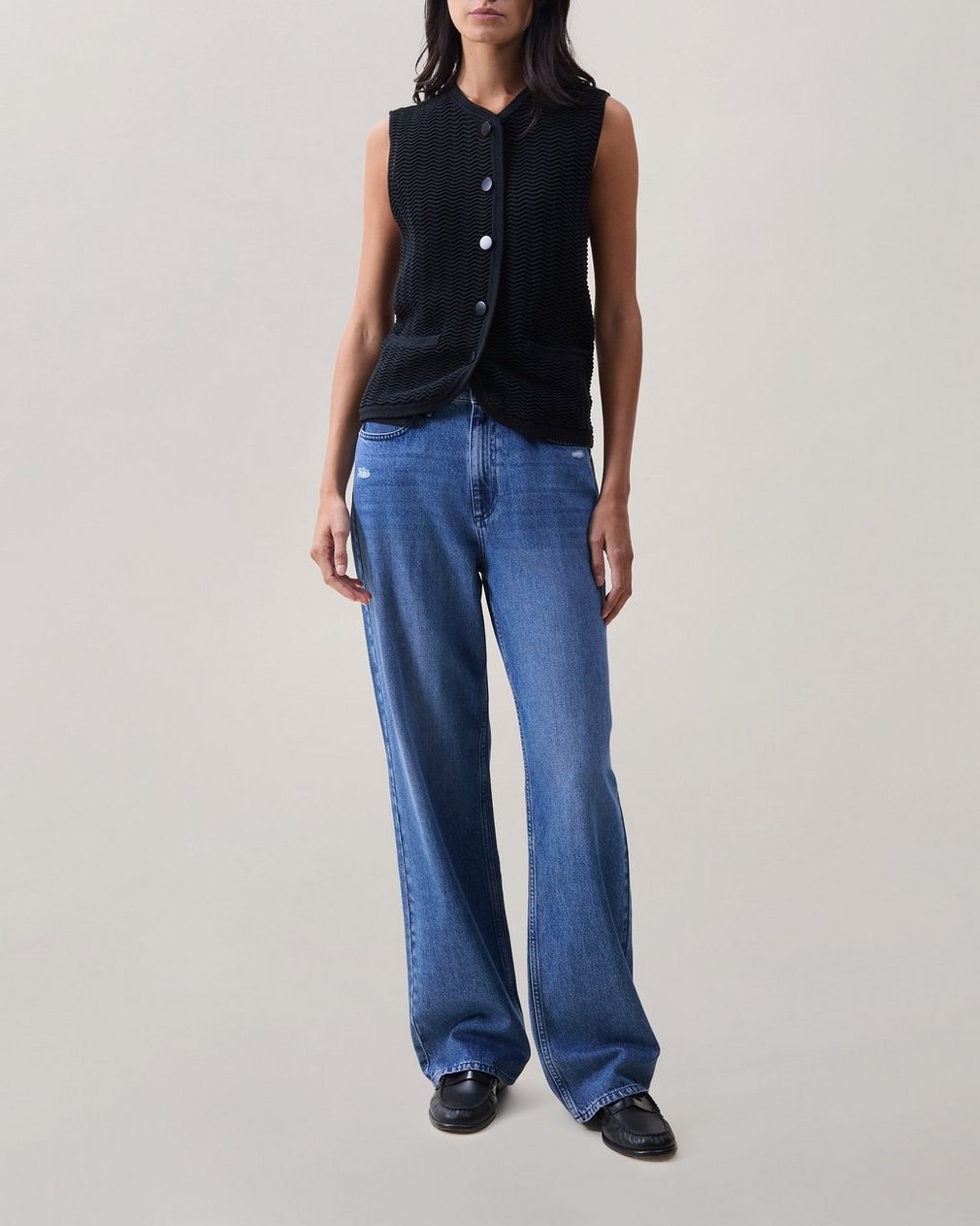 Lightweight layers. Crafted from a breathable cotton blend, this vest features a subtly open-knit design with a wavy texture for a modern twist on classic tailoring. Finished with a clean V-neckline and flat metal buttons. Wear it solo or layered over a crisp tee for an effortless look.